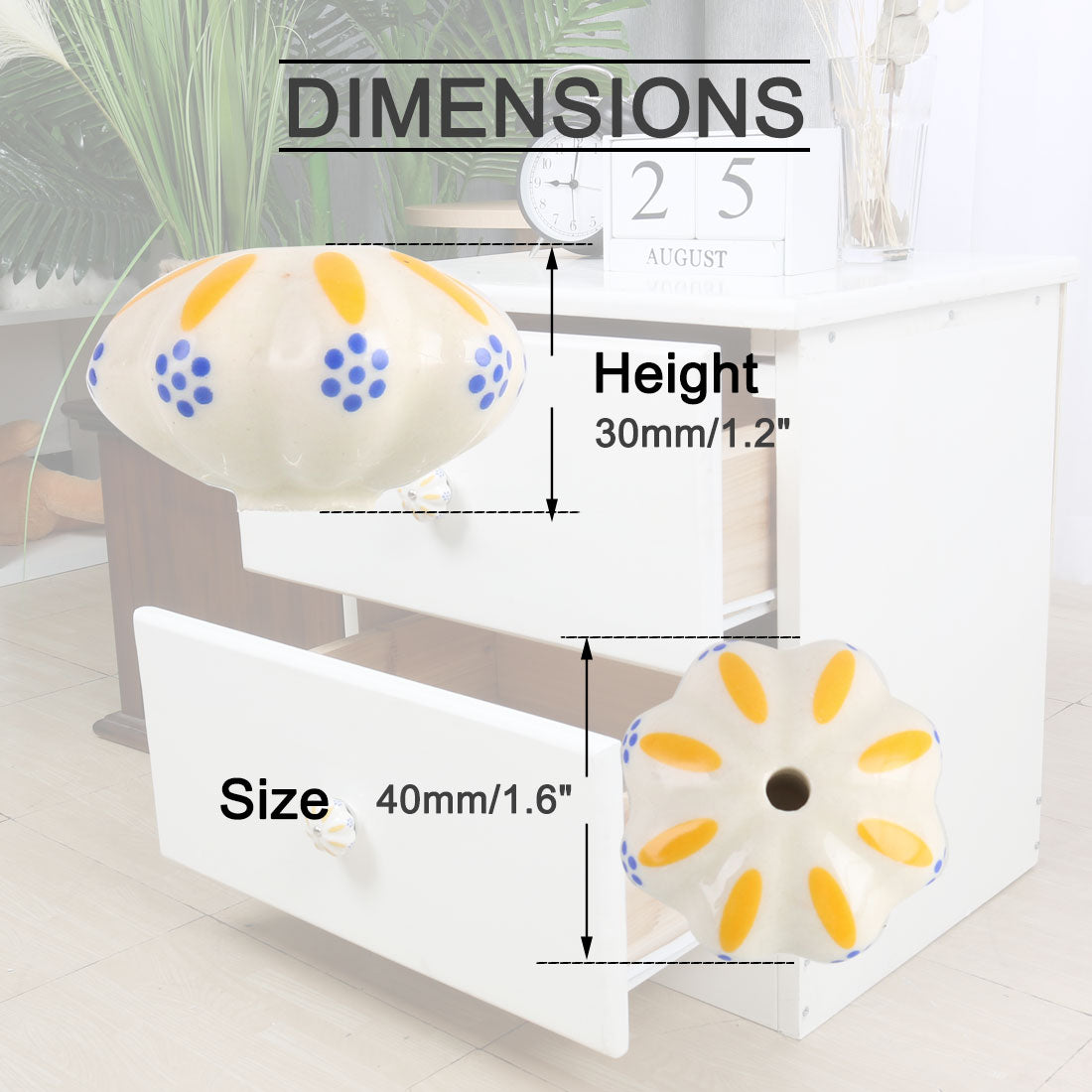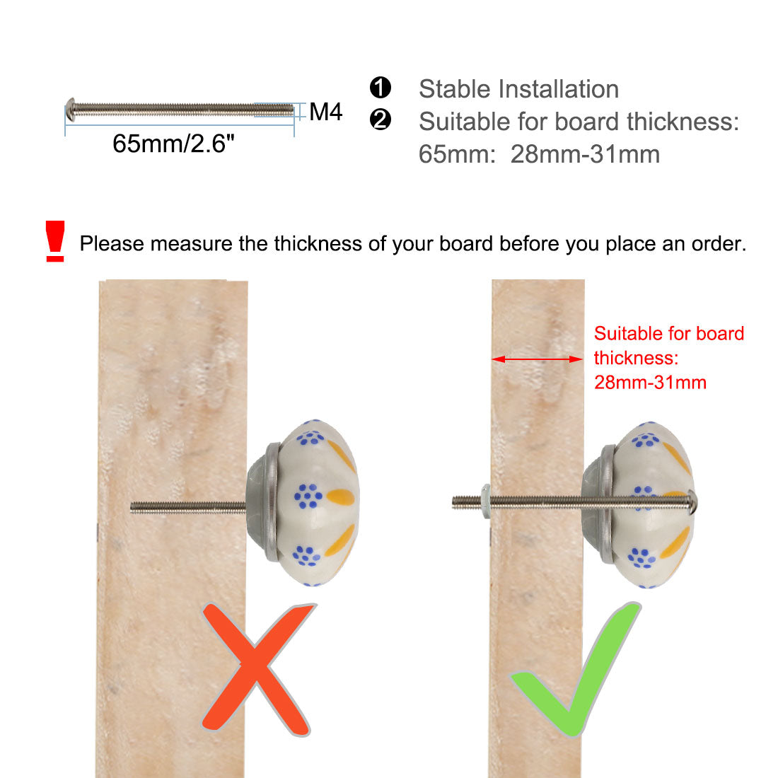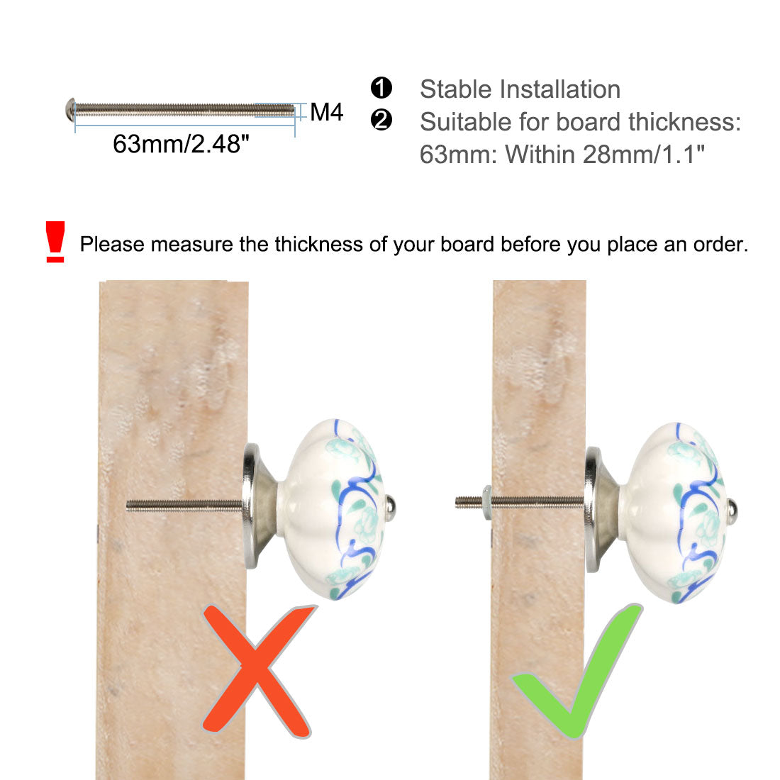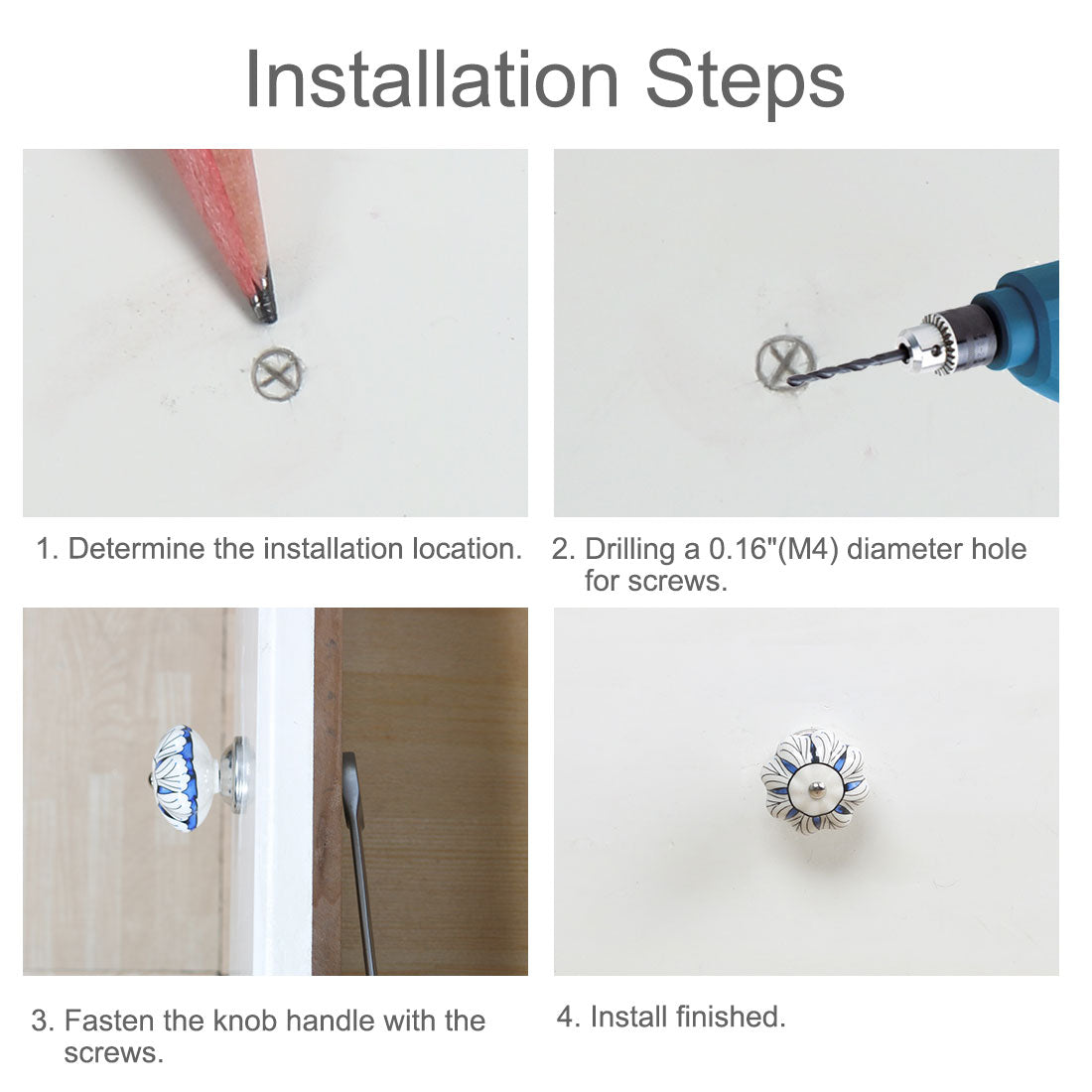 Description:The India pretty handmade or painted ceramic floral knobs are preferred for a drawer, cabinet, cupboard, wardrobe, door etc. Specification:Material: Ceramic, Aluminium AlloyKnob Diameter: 40mm/1.6 InchKnob Height(After Installation): 30mm-35mm/1.2 Inch-1.4 InchScrew Size : 65 x 7mm/2.6 Inch x 0.3 Inch(L*Max.D)Thread Dia: 4mm/0.16 InchEasy to fit - each knob comes with washers and nut fasteners.25 designs are available.Color: Cattleya, Robinia Idaho, Gazania, Maple Leaf, Vines, Five-pointed Star, Crinum Asiaticum, Mixed Color #1, Purple Tillandsia, Delphinium Anthriscifolium Hance, Mixed Color #2, Chilli, Zephyranthes Grandiflora, Snowflake, Black Tillandsia, Blue and White Banana Leaf, Blue and White Flower, Peony, Orange Flower, Pachira Macrocarpa, Pink Branches, Mixed Color #3, Mixed Color #4 Package Content:1 x Knob with Fittings or 6 x Knobs with Fittings :If there is any other problem, please email us at any time, we will provide you the best solution as soon as possible. Notice:1. Please allow 1-3mm error due to manual measurement.2. The colors may have a little bit different due to screen display or light.