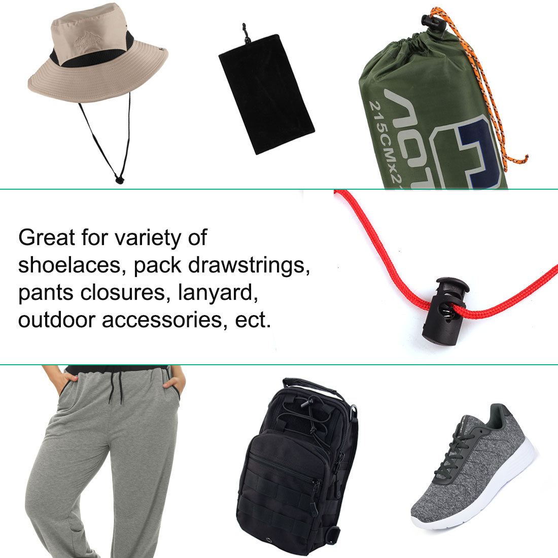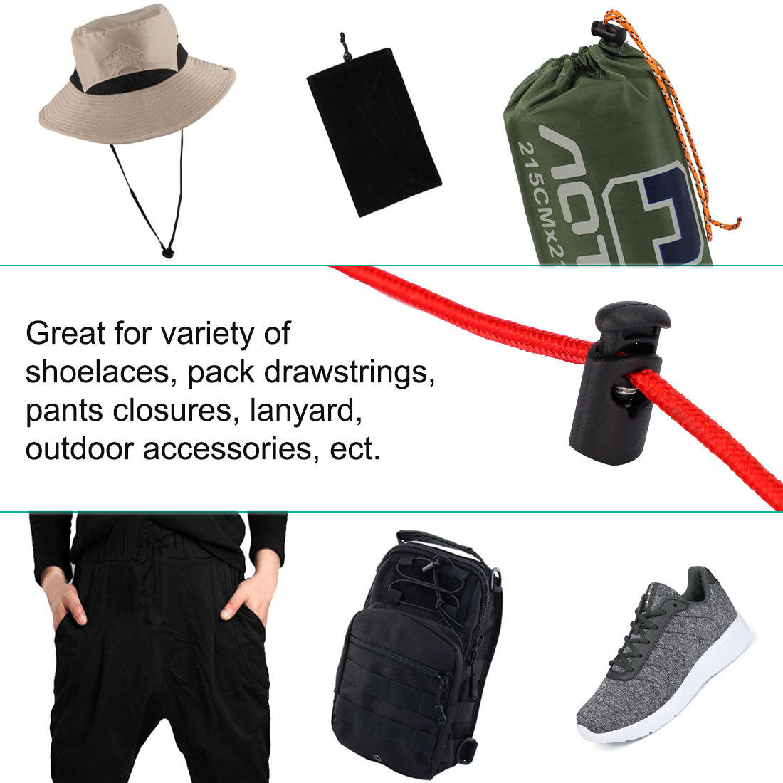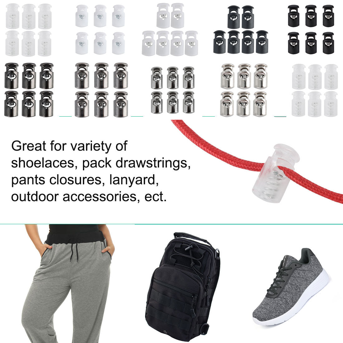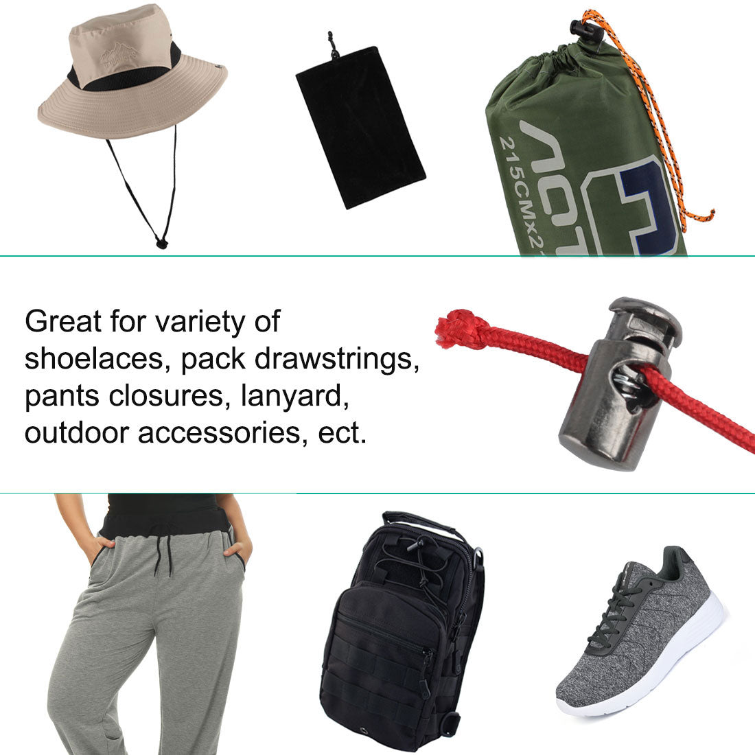 3. These cord locks fit a variety of different drawstrings and types of cords. Widely used on shoelaces, drawstrings, pants closures, lanyard, luggage, clothing, bag, backpack, sportwear, and a variety of outdoor and gym accessories.