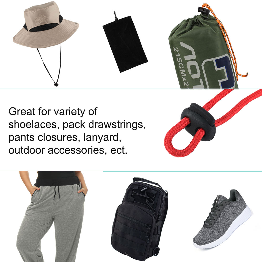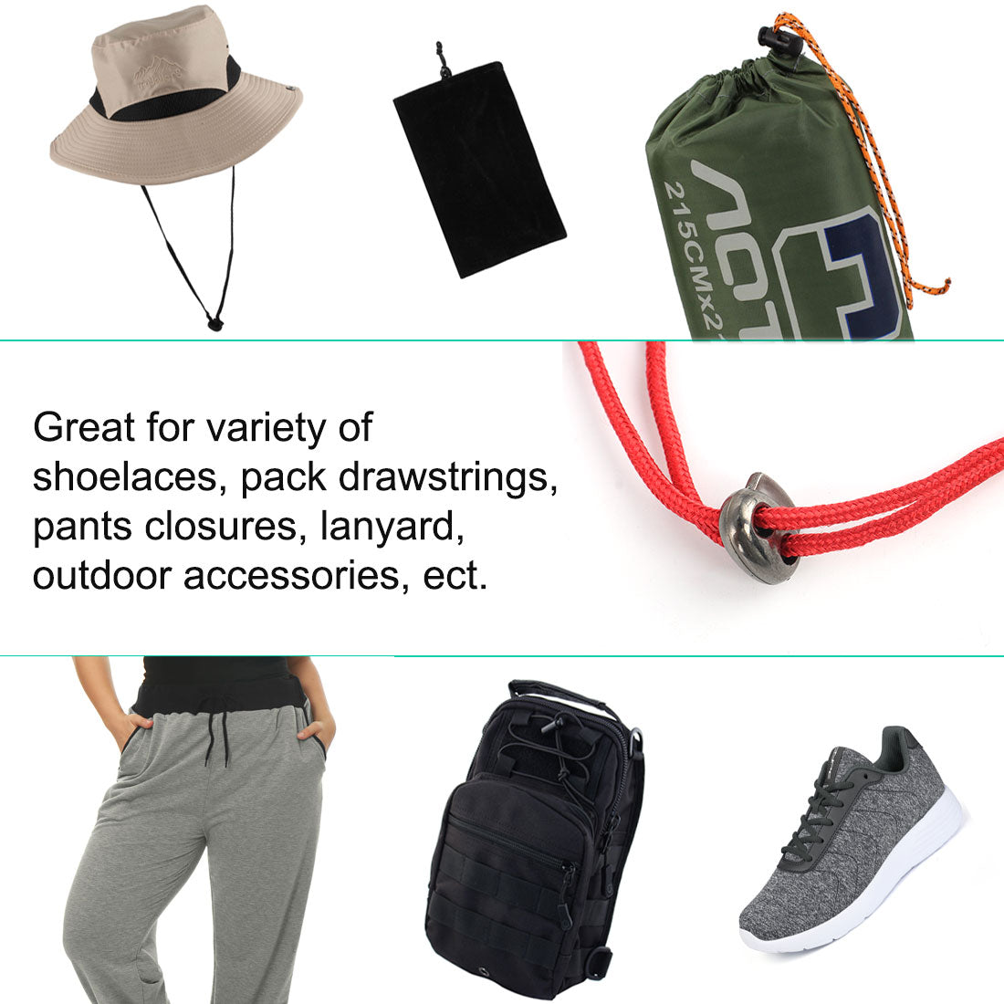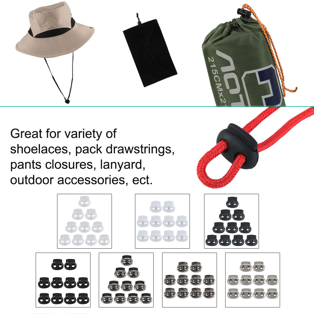 3. These cord locks fit a variety of different drawstrings and types of cords. Widely used on shoelaces, drawstrings, pants closures, lanyard, luggage, clothing, bag, backpack, sportwear, and a variety of outdoor and gym accessories.