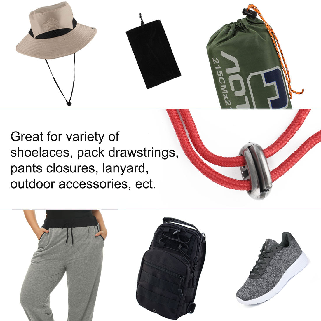 2. Tightening draw cords on bags and jackets, easy to fit. Great for use on sweat pants or hoodies to keep from losing the drawstring and to tighten the drawstring as well.