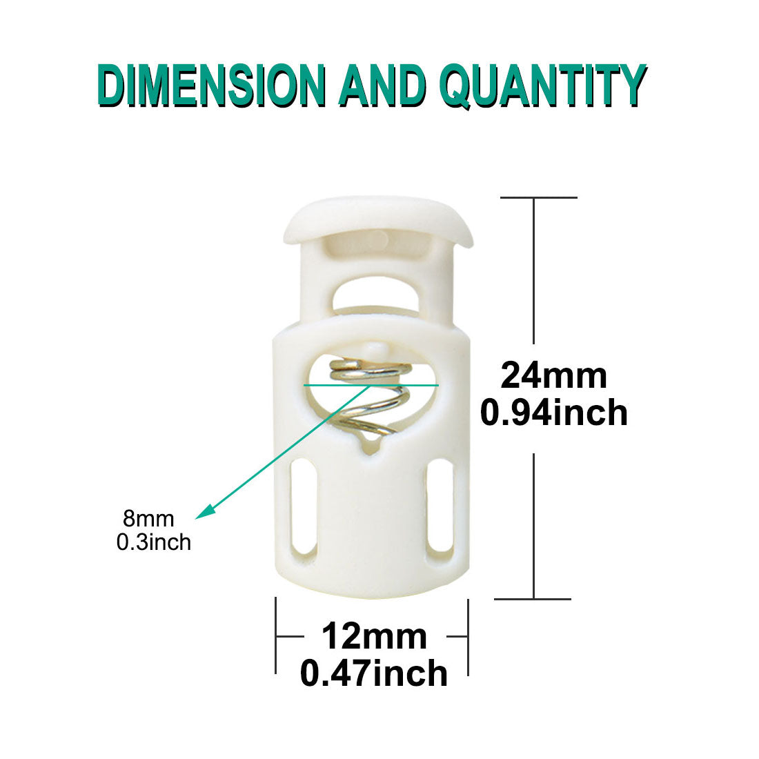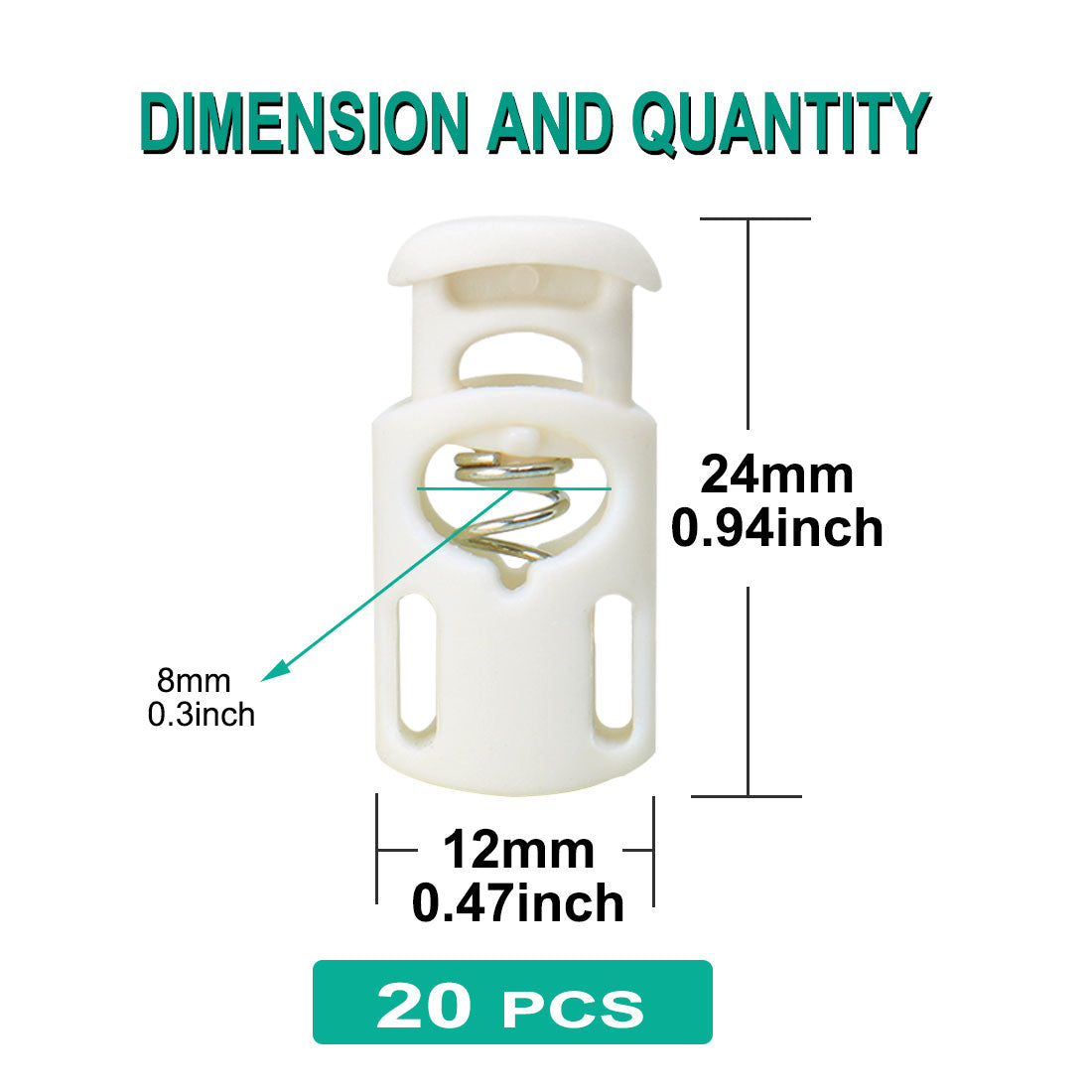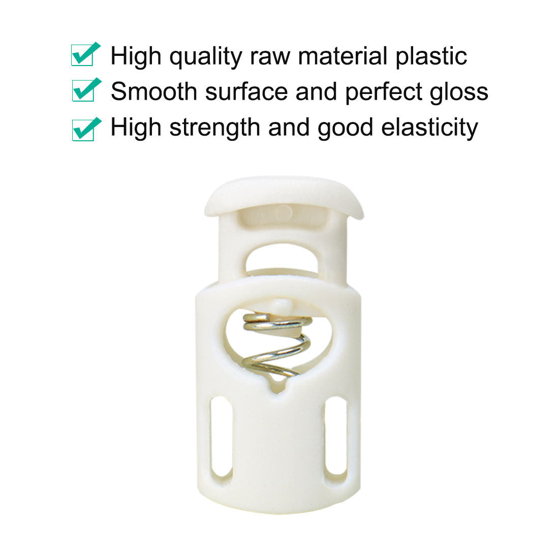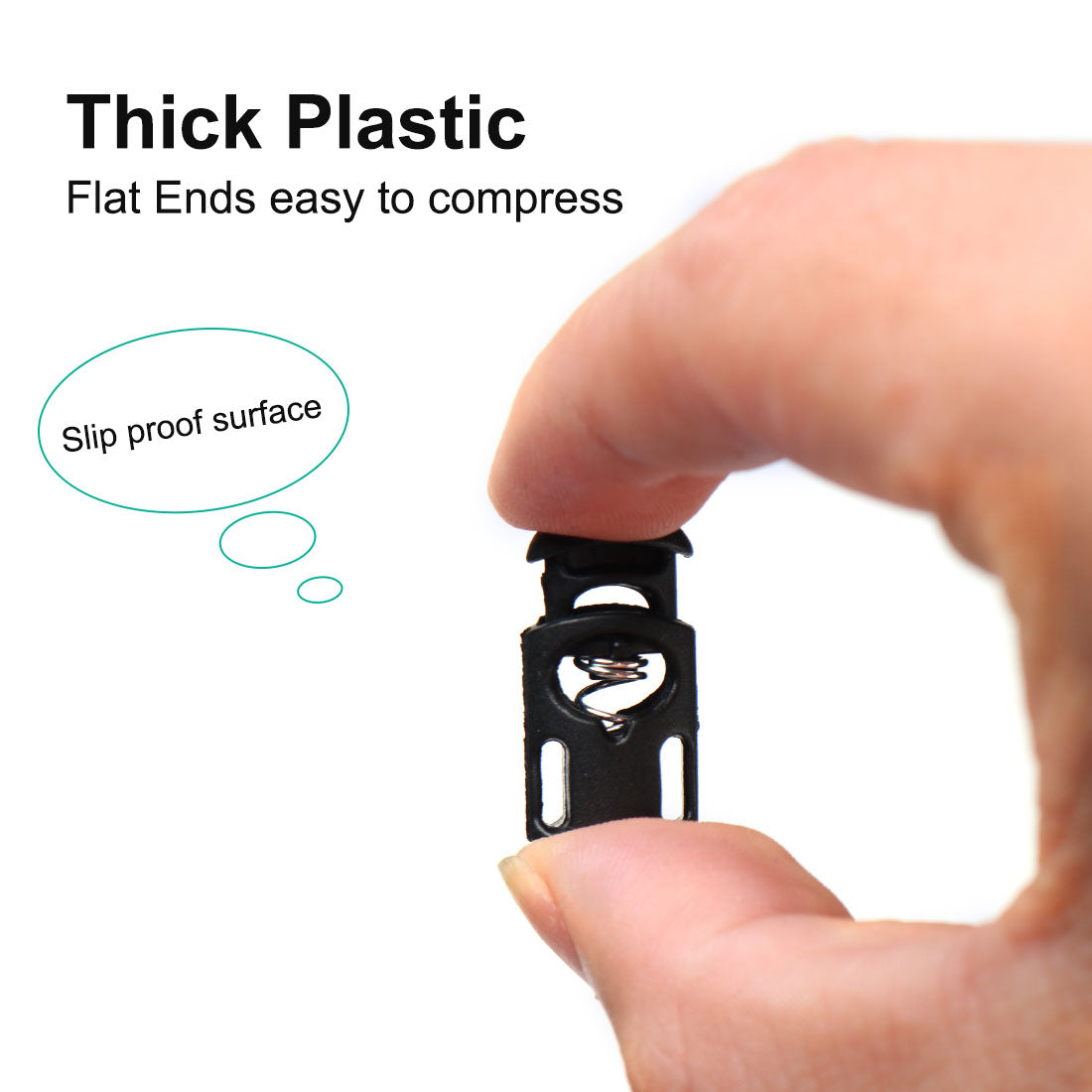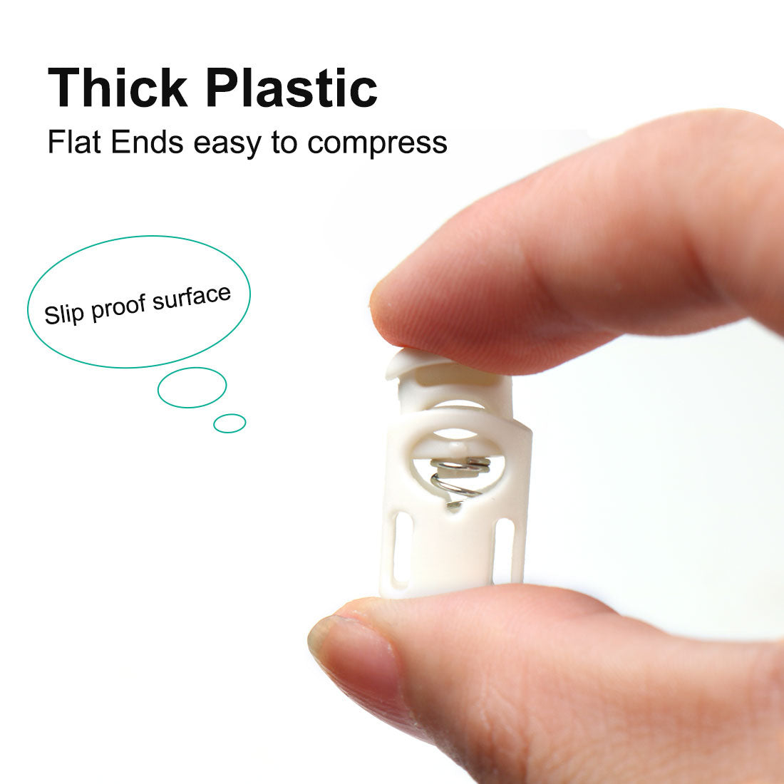 1. Made of plastic, durable and lightweight; The tough internal spring is built for long-lasting performance, flexible enough for easy use; Cord locks can be used in dryer or washing machine.