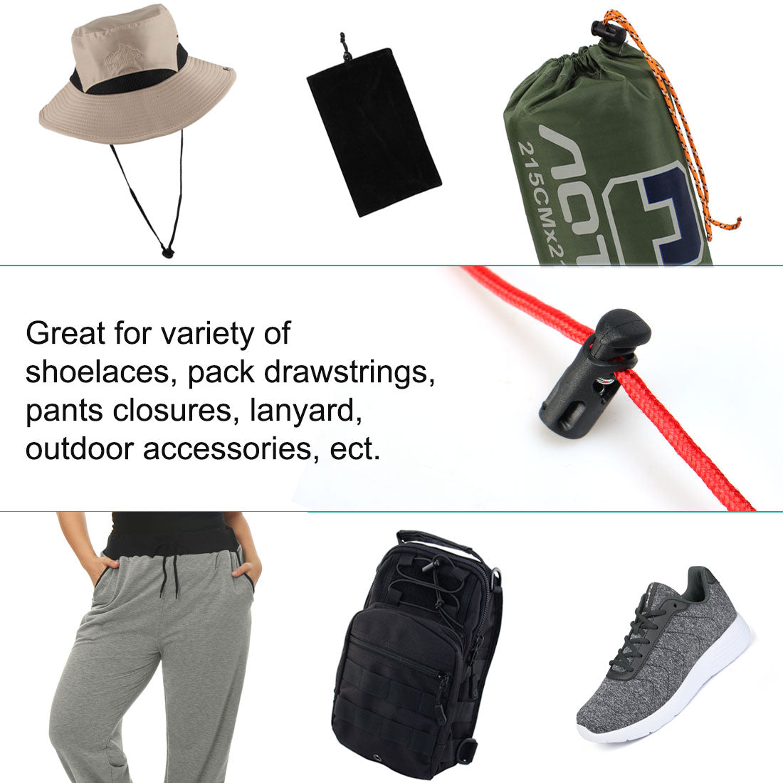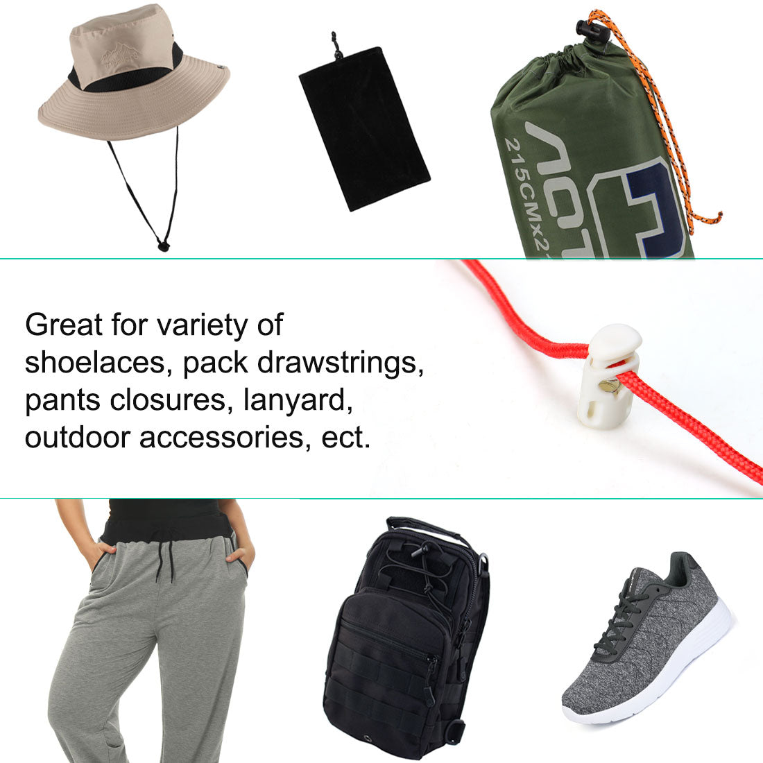 3. These cord locks fit a variety of different drawstrings and types of cords. Widely used on shoelaces, drawstrings, pants closures, lanyard, luggage, clothing, bag, backpack, sportwear, and a variety of outdoor and gym accessories.
