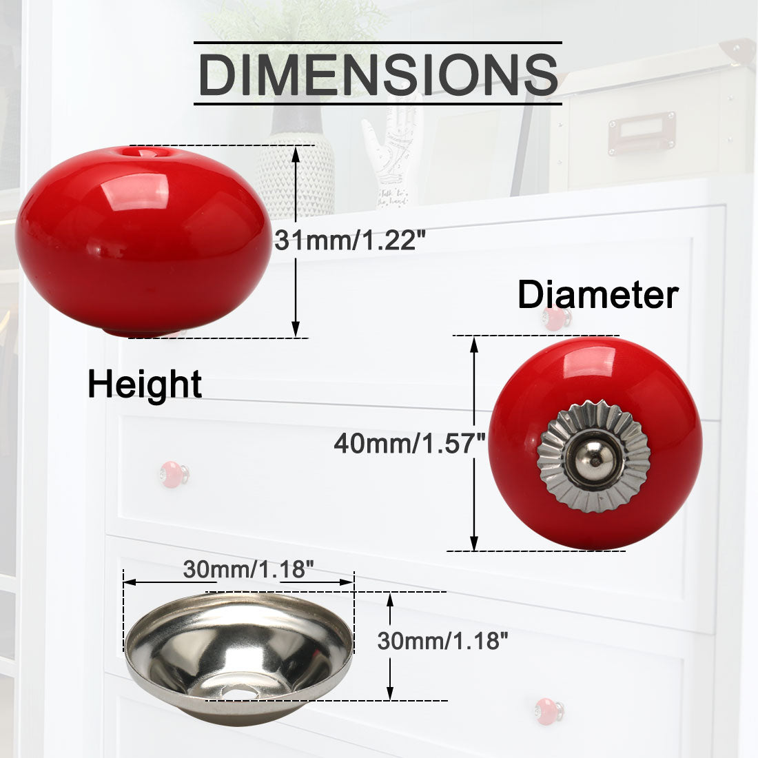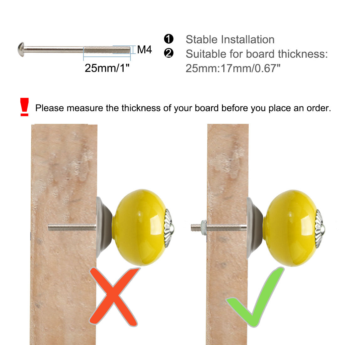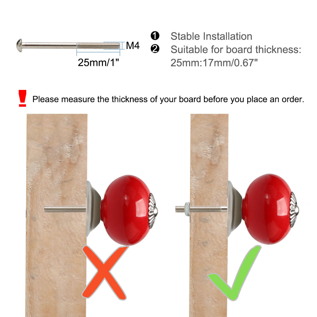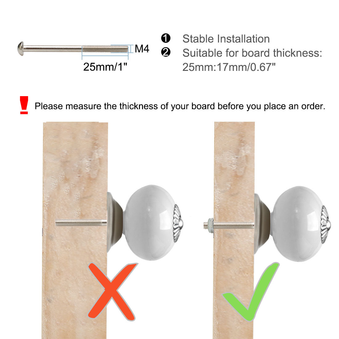 Check Size: Knob Height: 40mm/1.57"; Ceramic Knob Diameter: 40mm/1.57", Ceramic Knob Height: 31mm/1.22";Base Diameter: 30mm/1.18", Thread Diameter: 4mm/0.16"; Screw Thread Length: 25mm/1", Screw Rod Length: 30mm: 1.18" Fit for Board Thickness: within 17mm/0.67"