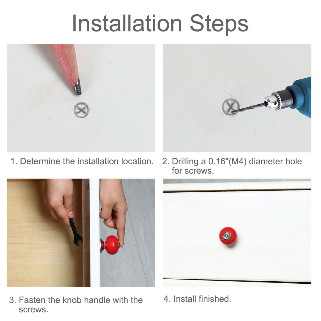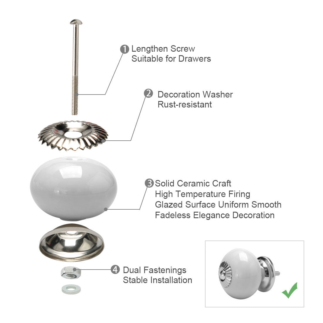 Package Content: 6 x Ceramic Knobs, 6 x Screws; We provide mounting screws for easy installation, which can be according to the thickness of the different boards. If the screws are not suitable, please prepare your own screw