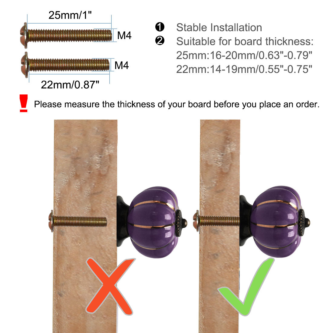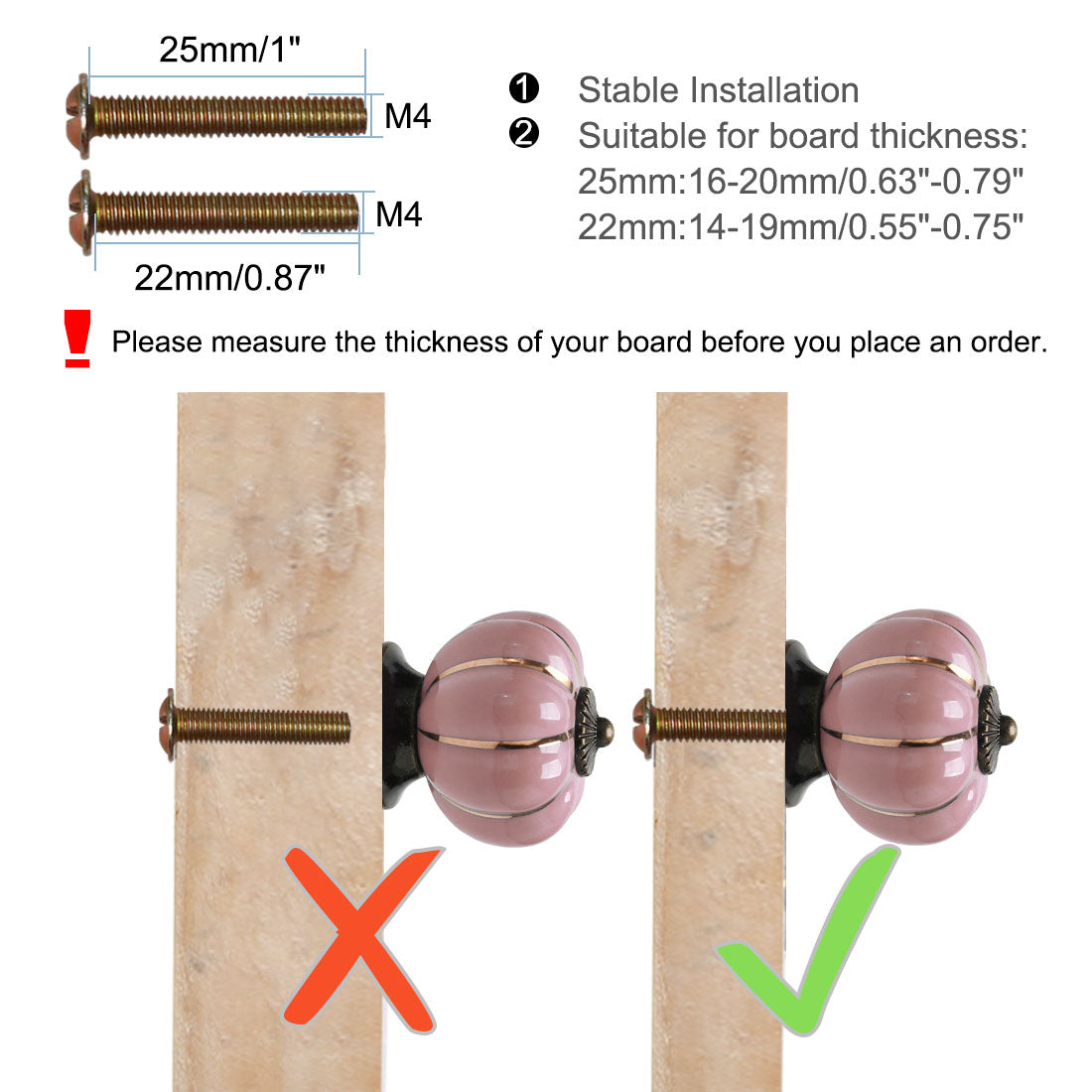 Package Content: 8 x Ceramic Knobs, 16 x Screws; We provide two sizes of mounting screws for easy installation, which can be selected according to the thickness of the different boards. If the screws are not suitable, please prepare your own screws
