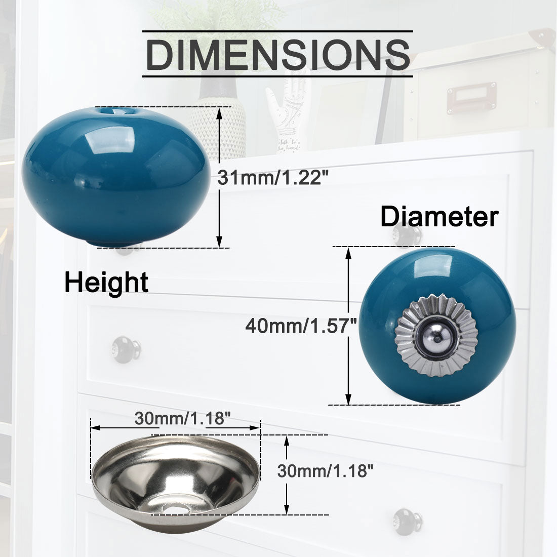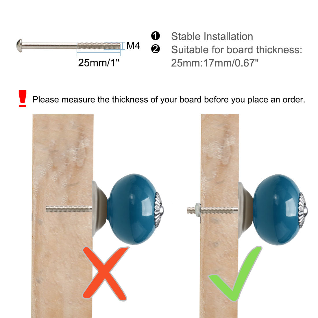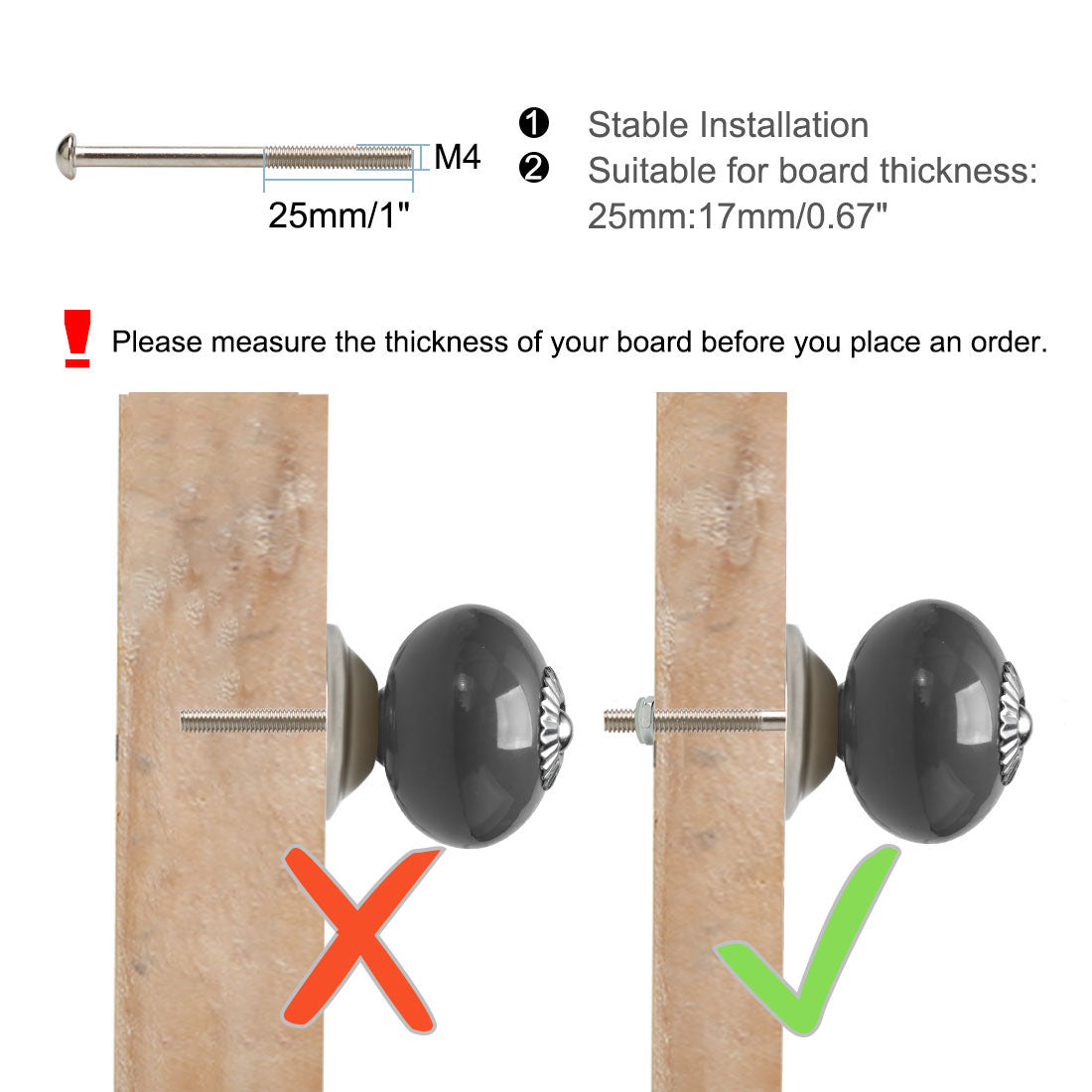 Check Size: Ceramic Knob Height: 31mm/1.22"; Knob Height: 40mm/ 1.57"; Knob Diameter: 40mm/1.57", Base Diameter: 30mm/1.18", Thread Diameter: 4mm/0.16"; Screw Thread Length: 25mm/1", Screw Rod Length: 30mm: 1.18" Fit for Board Thickness: within 17mm/0.67"