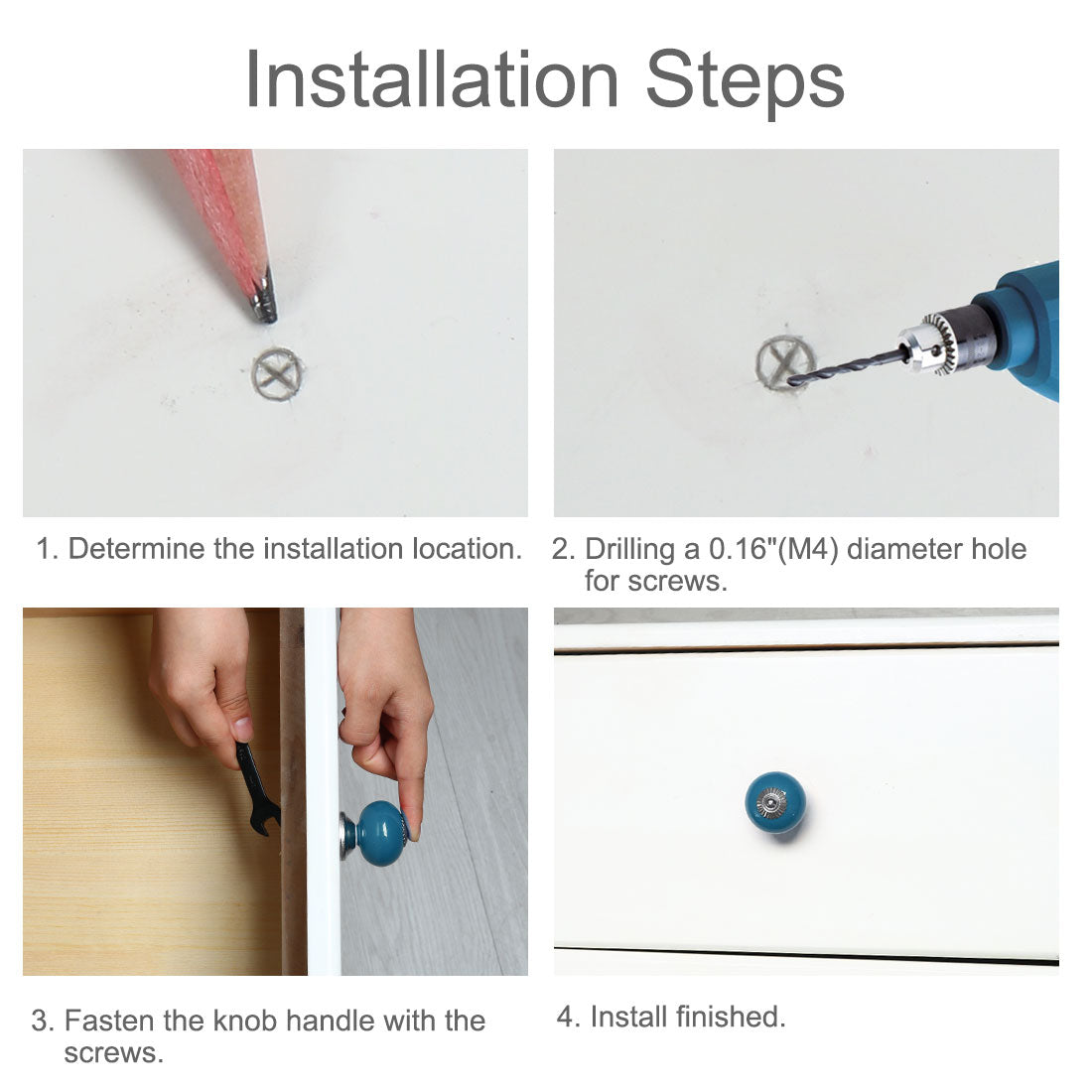 Package Content: 4 x Ceramic Knobs, 4 x Screws; We provide mounting screws for easy installation, which can be according to the thickness of the different boards. If the screws are not suitable, please prepare your own screw