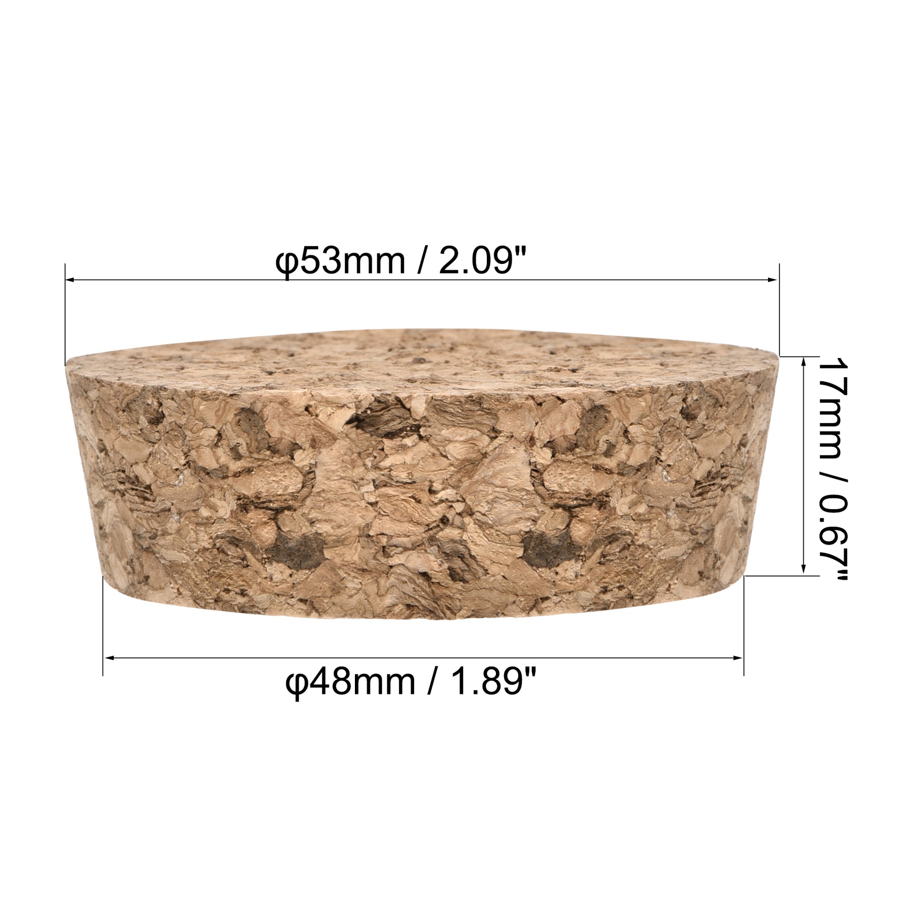 Descriptions: 1. Top Diameter: 53mm / 2.09 inch; Bottom Diameter: 48mm / 1.89 inch; Height: 17mm / 0.67 inch. 2. Made of cork, good density, hardness, flexibility and elasticity, help to enhance sealing performance, good replacement cork plugs fit your needs. 3. Conical design, easy to install and can seal the bottle tightly. 4. High temperature resistance, acid and alkali resistance, widely used for sealing the opened bottle or test tube in the lab, home, crafts, and DIY projects, etc. Great for glass can, wish bottle, decoration, etc.