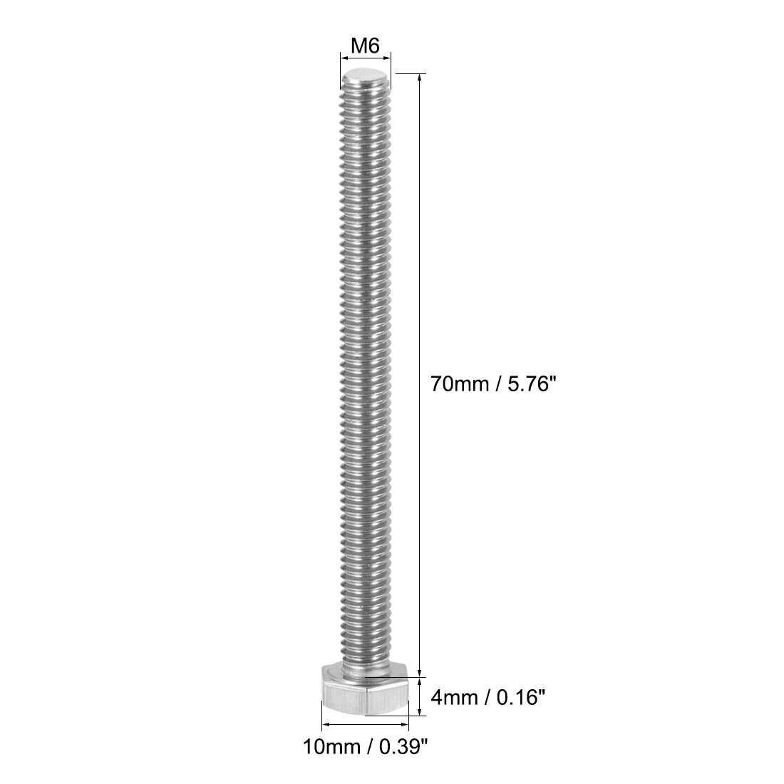 Specification: Product Name: Hex Bolts Material: 304 Stainless Steel Color: Silver Tone Dimension: M6 x 70mm Rod Length: 70mm / 2.76" Pitch: 1mm / 0.04" Hex Width: 10mm / 0.39" Hex Thickness: 4mm / 0.16" Tightening Torque: 9-12 · m Standard: ISO4017/DIN933 Package Content: 5 x Hex Bolts