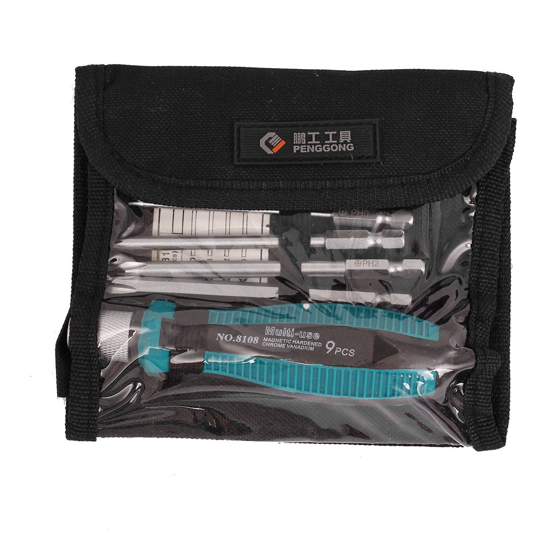 4pcs slotted bits( 3mm,4mm,5mm,6mm) and 4pcs phillips bits(PH0,PH1,PH2,PH3), 1pcs plastic holder handle, come with a carry bag. Features nonslip plastic handle, for a easy and secure grip. With magnetic screwdriver head, can hold screws or other small parts. Compact and easy to carry, an useful tool for repair works.