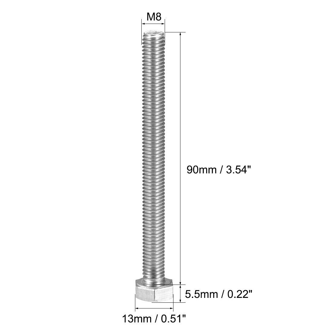 Specification: Product Name: Hex Bolts Material: 304 Stainless Steel Color: Silver Tone Dimension: M8 x 90mm Rod Length: 90mm/3.5" Pitch: 1.25mm / 0.05" Hex Width: 13mm / 0.51" Hex Thickness: 5mm / 0.2" Tightening Torque: 22-30 · m Standard: ISO4017/DIN933 Package Content: 8 x Hex Bolts