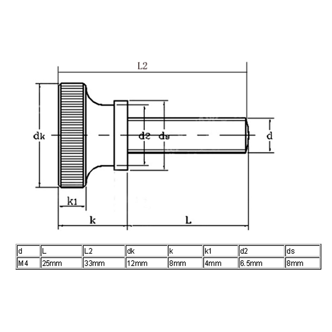 M4x25mm Round thumb screw with flat knurled head style. Knurled head provides extra grip for manual tightening. Usually found on thumb screws, a knurled surface on the head gives a better gripping surface, making it easier to tighten or loosen fasteners manually. Thumb screws are designed to be tightened and loosened by hand. Tools not necessary for tightening or loosening Knurled Thumb Screws are installed with your fingers and are used to hold light covers in place and other ornamental products.