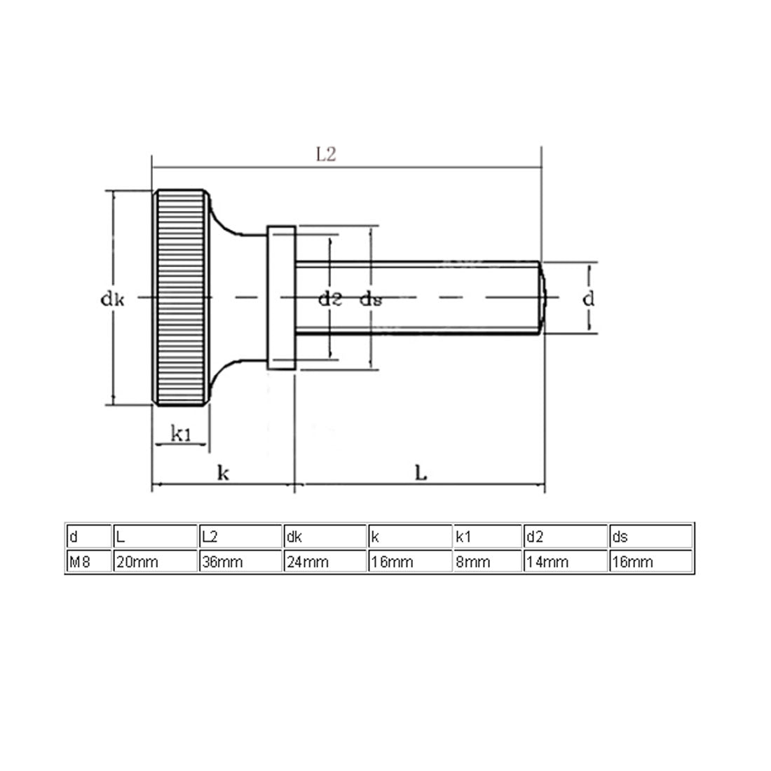 M8x20mm Round thumb screw with flat knurled head style. Knurled head provides extra grip for manual tightening. Usually found on thumb screws, a knurled surface on the head gives a better gripping surface, making it easier to tighten or loosen fasteners manually. Thumb screws are designed to be tightened and loosened by hand. Tools not necessary for tightening or loosening Knurled Thumb Screws are installed with your fingers and are used to hold light covers in place and other ornamental products.