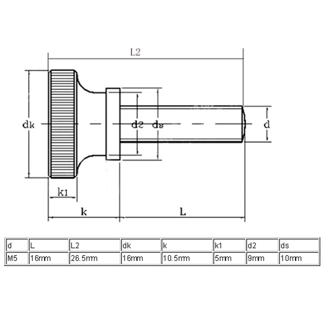 M5x16mm Round thumb screw with flat knurled head style. Knurled head provides extra grip for manual tightening. Usually found on thumb screws, a knurled surface on the head gives a better gripping surface, making it easier to tighten or loosen fasteners manually. Thumb screws are designed to be tightened and loosened by hand. Tools not necessary for tightening or loosening Knurled Thumb Screws are installed with your fingers and are used to hold light covers in place and other ornamental products.