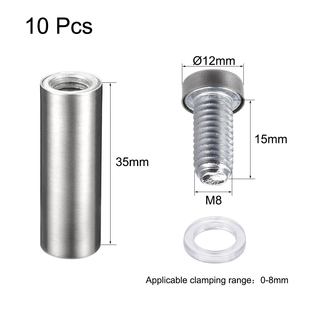 Specification: Total Size: 12mmx40mm/0.47"x1.57"(D*L) Thread Size: 8mmx15mm/0.31"x0.59"(D*L) Bottom Hole Dia.: 5mm/0.2" For Max Panel Thickness: 8mm/0.31" For Max Panel Hole Dia.: 10mm/0.39" Screw Nail Cap Thickness: 0-8mm Elevates Signage Height: 35mm/1.38" Surface Treatment: Bright finished Color: Silver Material: Stainless Steel Package Includes: 10 Pack x Glass Standoffs, 20 Pack x Rubber Spacers