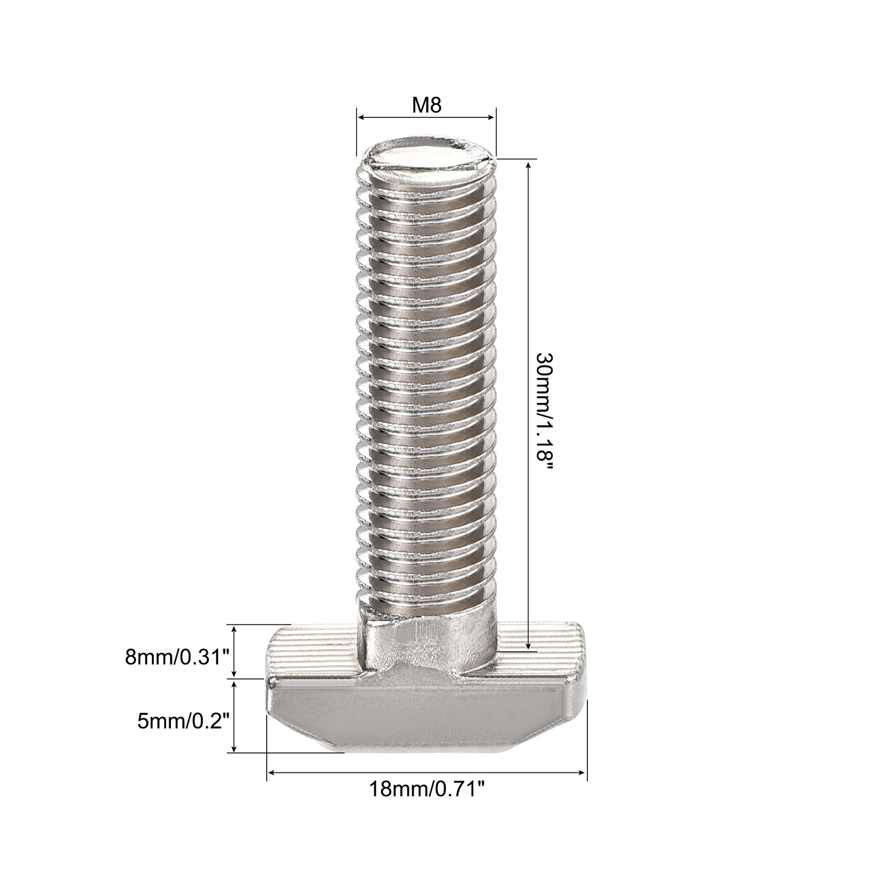 Specification: Material: Medium Carbon Steel Performance Rate: 6.8 Heat Treatment: Quenching + Tempering Surface Treatment: Chrome Plating Applicable Aluminum Profile: 40 Series Dimension: M8 x 30mm Rod Length: 30mm/1.18" Pitch: 1.25mm/ 0.05" Head Size: 18 x 8 x 5mm/0.71" x 0.31" x 0.2"(L*W*T)