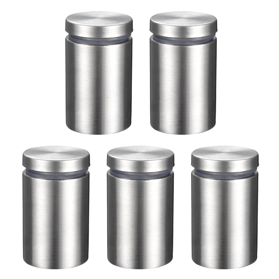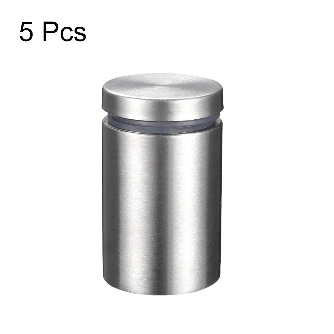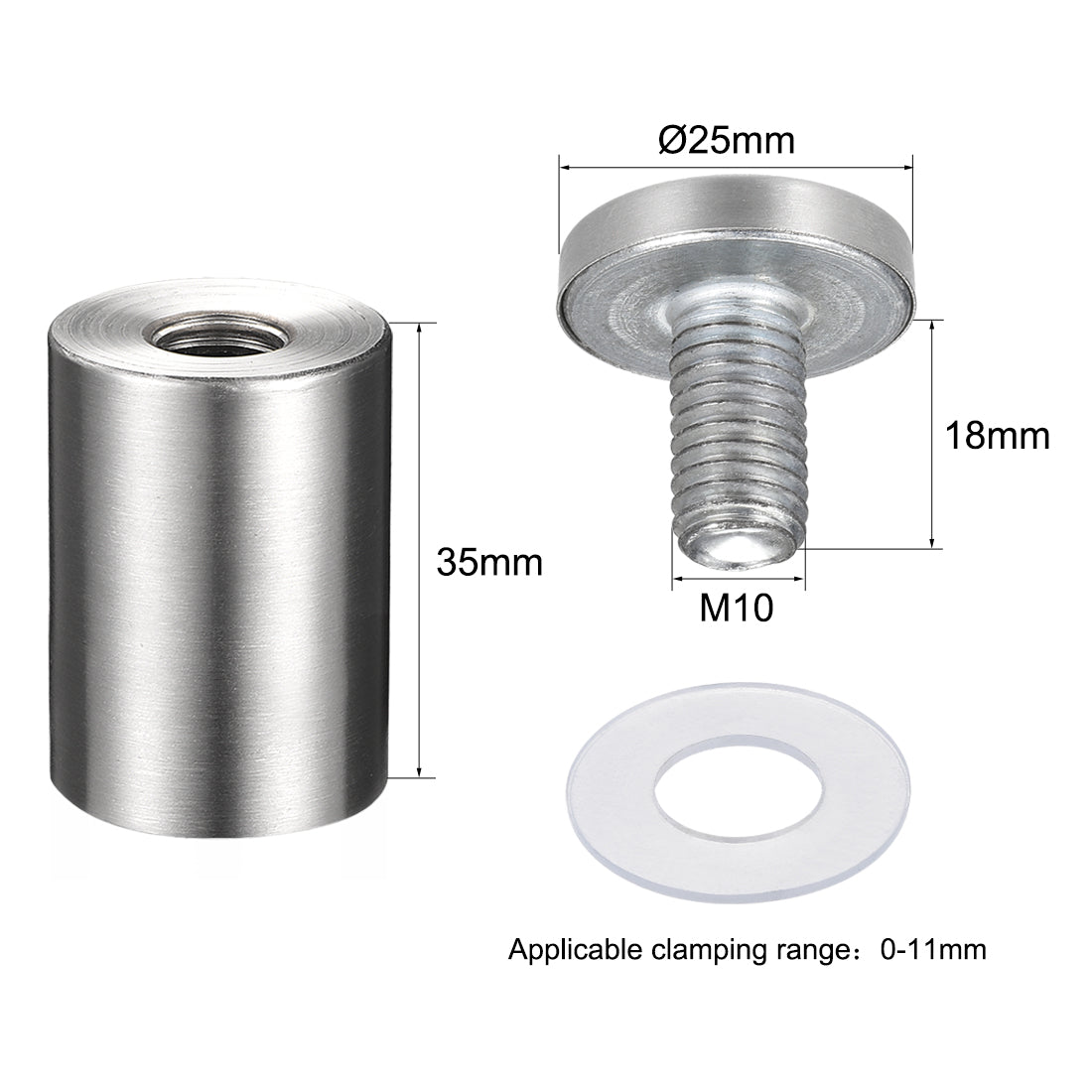 Specification: Total Size: 25mmx40mm/0.98"x1.57"(D*L) Thread Size: 10mmx18mm/0.39"x0.71"(D*L) Bottom Hole Dia.: 5mm/0.2" For Max Panel Thickness: 12mm/0.47" For Max Panel Hole Dia.: 12mm/0.47" Screw Nail Cap Thickness: 0-11mm Elevates Signage Height: 35mm/1.38" Surface Treatment: Bright finished Color: Silver Material: Stainless Steel Package Includes: 5 Pack x Glass Standoffs, 10 Pack x Rubber Spacers