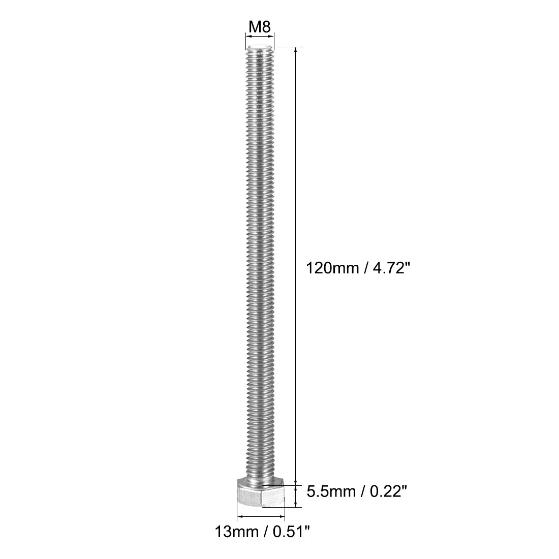 Specification: Product Name: Hex Bolts Material: 304 Stainless Steel Color: Silver Tone Dimension: M8 x 120mm Rod Length: 120mm / 4.74" Pitch: 1.25mm / 0.05" Hex Width: 13mm / 0.51" Hex Thickness: 5.5mm / 0.22" Tightening Torque: 22-30 · m Standard: ISO4017/DIN933 Package Content: 6 x Hex Bolts