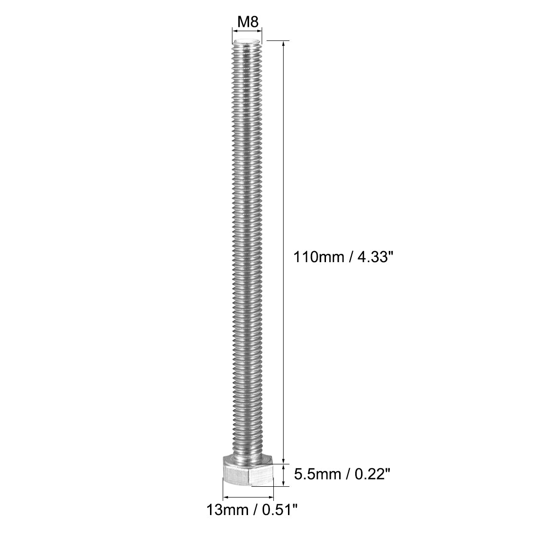 Specification: Product Name: Hex Bolts Material: 304 Stainless Steel Color: Silver Tone Dimension: M8 x 110mm Rod Length: 110mm / 4.33" Pitch: 1.25mm / 0.05" Hex Width: 13mm / 0.51" Hex Thickness: 5mm / 0.2" Tightening Torque: 22-30 · m Standard: ISO4017/DIN933 Package Content: 5 x Hex Bolts