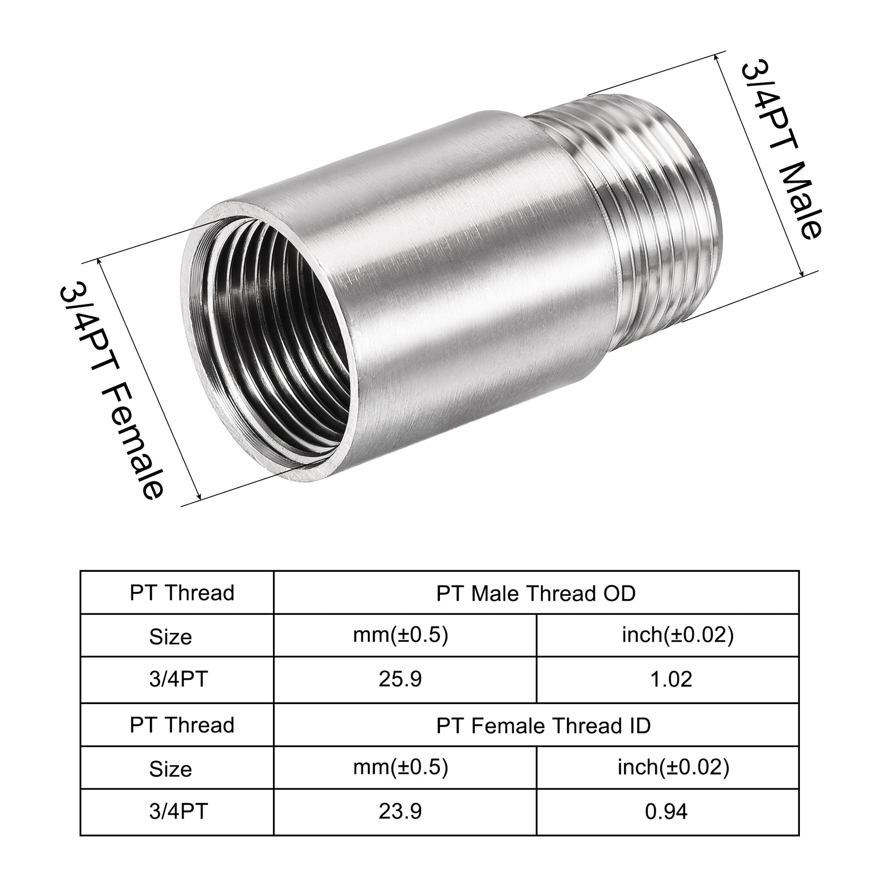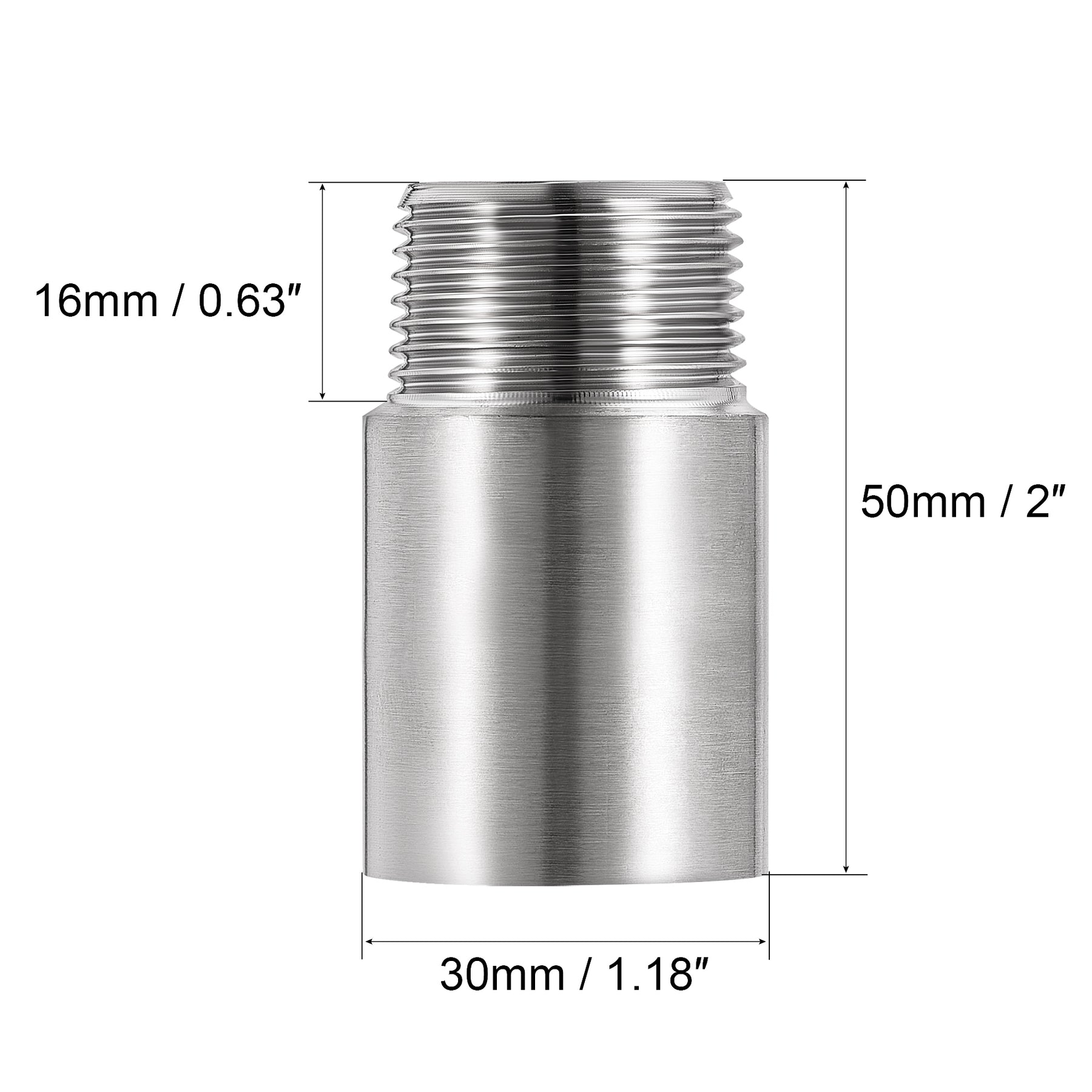 Specifications: Material: 304 Stainless Steel Male Thread Size: G3/4(Approx OD 25.7mm) Female Thread Size: G3/4(Approx ID 24mm) Thread Length: 16mm / 0.63 inch Total Size: 50mm x 30mm / 2 inch x 1.18 inch(L*D)