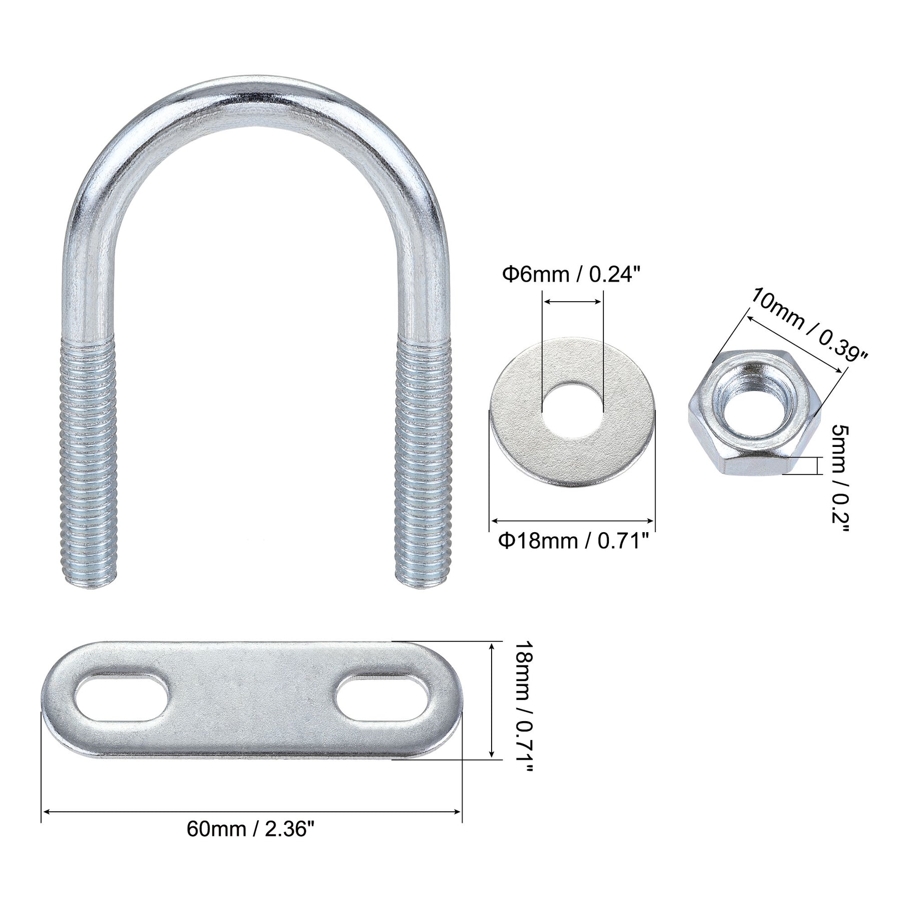 Specification: Product Name: U-Bolt Material: Steel Surface Treatment: Galvanized Main Color: Silver Tone Thread Dia.: M6 Fit Rod Size: 27mm / 1.06" Rod Diameter: 5.2mm / 0.2" Total Length: 53mm / 2.09" Hex Nut Size: 10 x 5mm / 0.39" x 0.2"(Hex Width*H) Frame Plate Size: 60 x 18 x 2mm / 2.36" x 0.71" x 0.08"(L*W*T) Round Washers Size: 18 x 6 x 1mm / 0.71" x 0.24" x 0.04"(OD*ID*T)