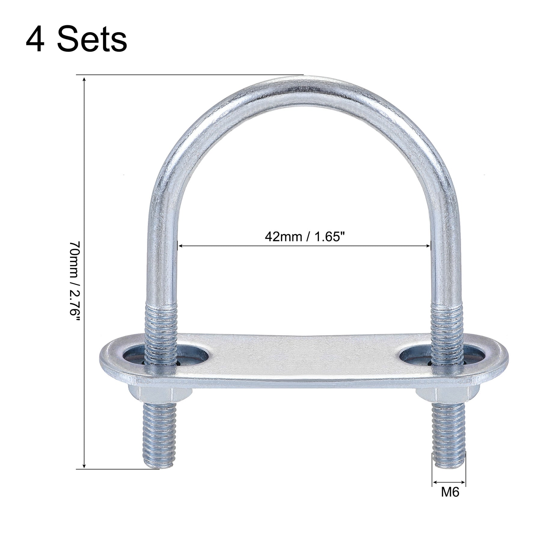 Specification: Product Name: U-Bolt Material: Steel Surface Treatment: Galvanized Main Color: Silver Tone Thread Dia.: M6 Fit Rod Size: 42mm / 1.65" Rod Diameter: 5.2mm / 0.2" Total Length: 70mm / 2.76" Hex Nut Size: 10 x 5mm / 0.39" x 0.2"(Hex Width*H) Frame Plate Size: 70 x 20 x 2mm / 2.78" x 0.79" x 0.08"(L*W*T) Round Washers Size: 18 x 6 x 1mm / 0.71" x 0.24" x 0.04"(OD*ID*T)