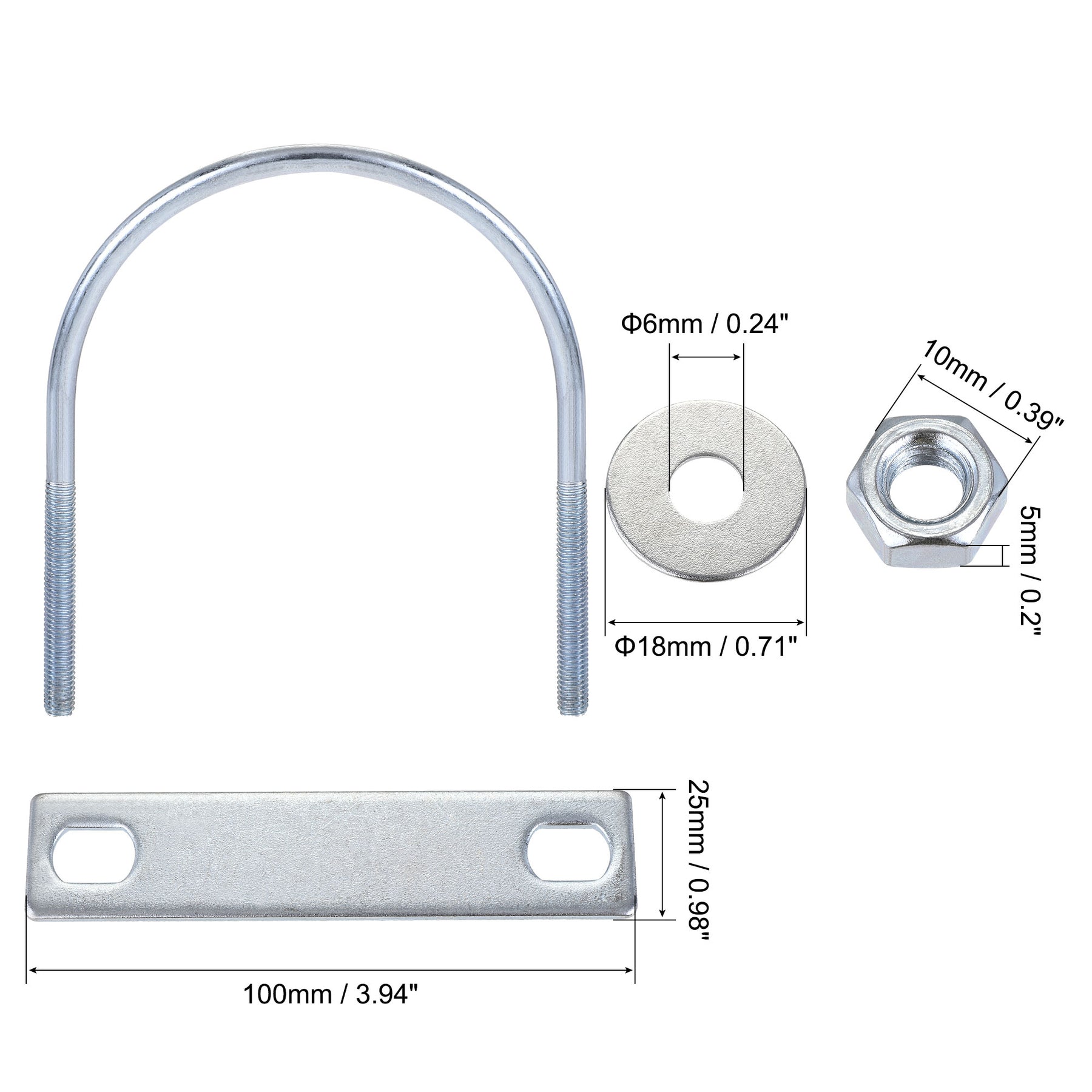 Specification: Product Name: U-Bolt Material: Steel Surface Treatment: Galvanized Main Color: Silver Tone Thread Dia.: M6 Fit Rod Size: 95mm / 3.74" Rod Diameter: 5.2mm / 0.2" Total Length: 110mm / 4.33" Hex Nut Size: 10 x 5mm / 0.39" x 0.2"(Hex Width*H) Frame Plate Size: 100 x 25 x 3mm / 3.94" x 0.98" x 0.12"(L*W*T) Round Washers Size: 18 x 6 x 1mm / 0.71" x 0.24" x 0.04"(OD*ID*T)