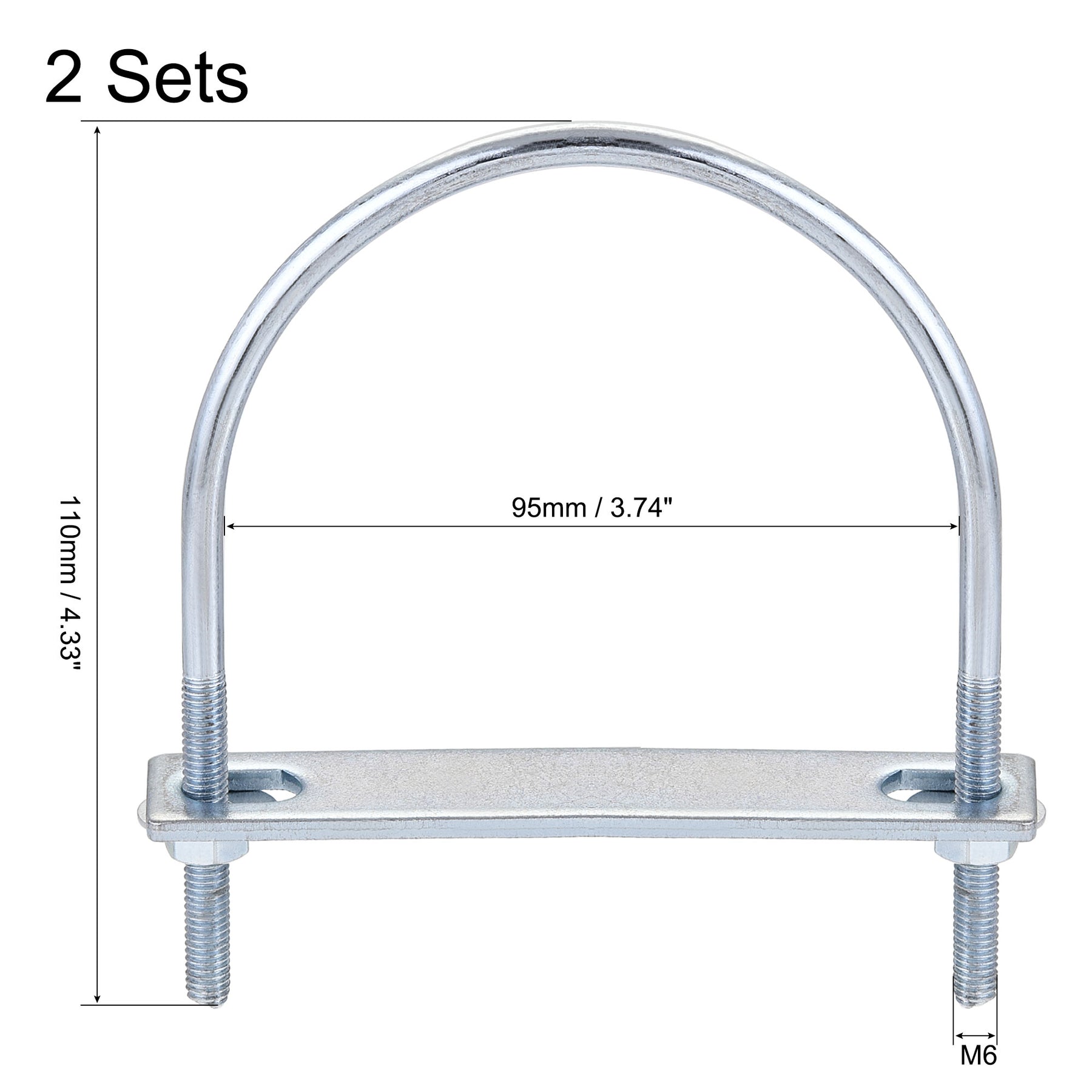 Specification: Product Name: U-Bolt Material: Steel Surface Treatment: Galvanized Main Color: Silver Tone Thread Dia.: M6 Fit Rod Size: 95mm / 3.74" Rod Diameter: 5.2mm / 0.2" Total Length: 110mm / 4.33" Hex Nut Size: 10 x 5mm / 0.39" x 0.2"(Hex Width*H) Frame Plate Size: 100 x 25 x 3mm / 3.94" x 0.98" x 0.12"(L*W*T) Round Washers Size: 18 x 6 x 1mm / 0.71" x 0.24" x 0.04"(OD*ID*T)