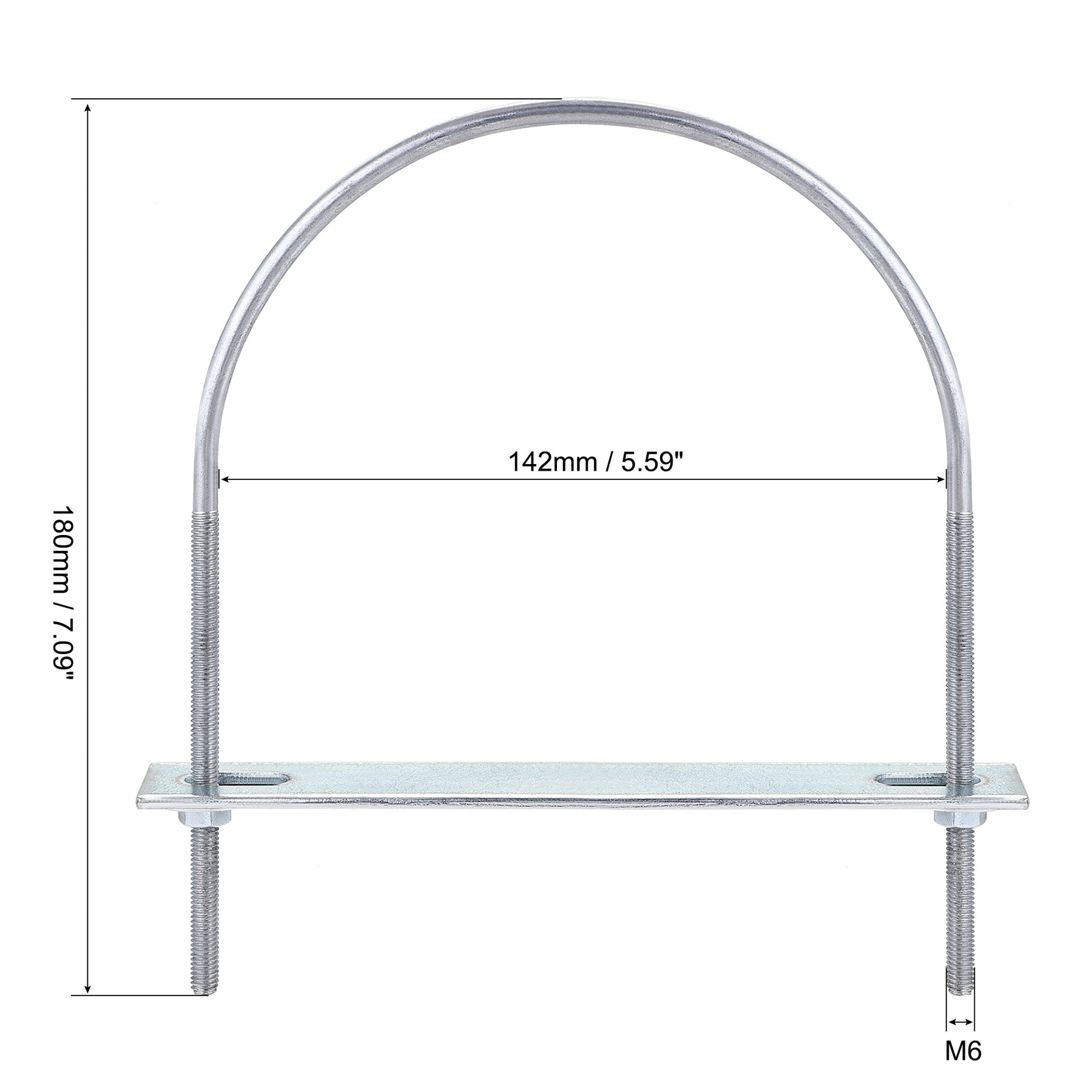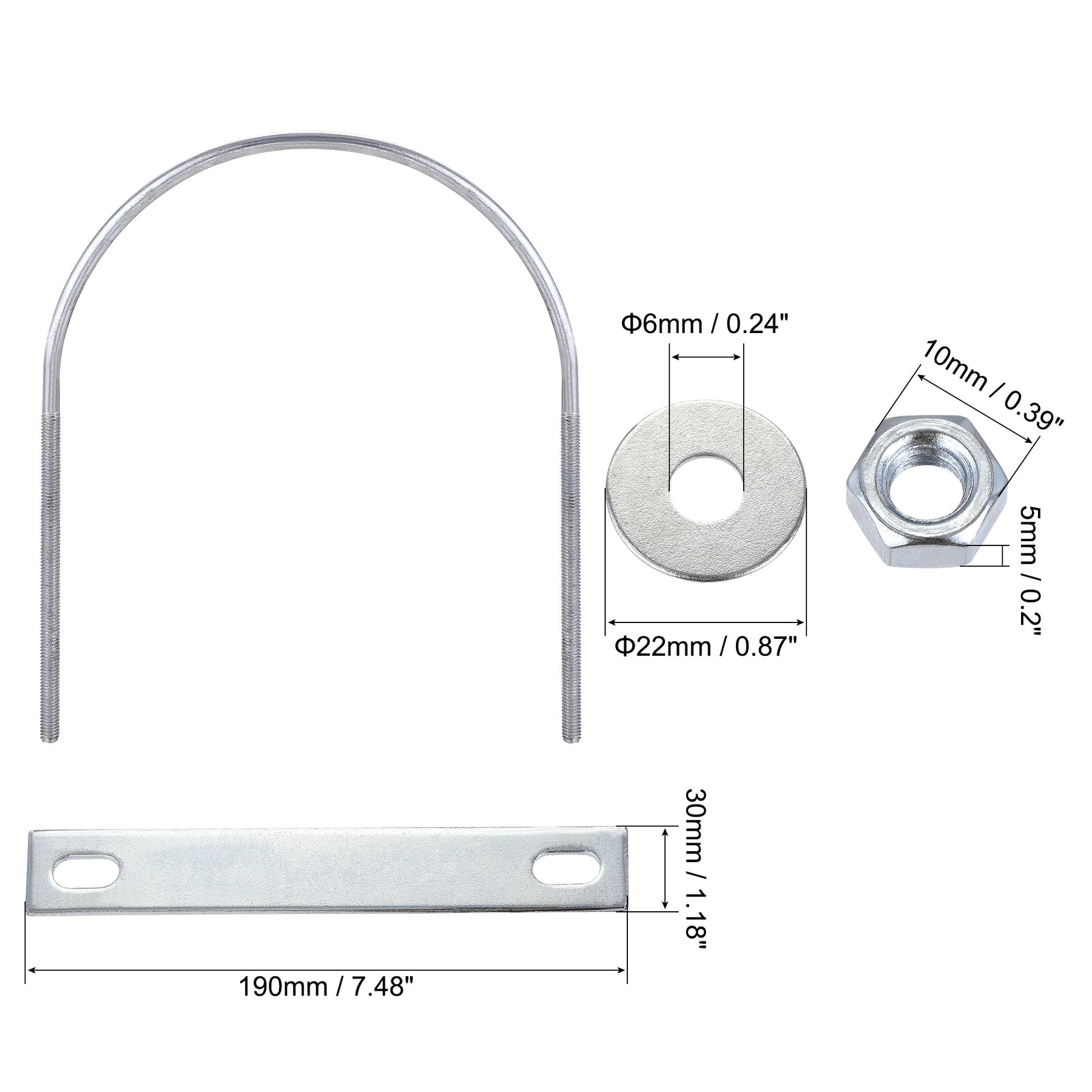 Specification: Product Name: U-Bolt Material: Steel Surface Treatment: Galvanized Main Color: Silver Tone Thread Dia.: M6 Fit Rod Size: 142mm / 5.59" Rod Diameter: 5.2mm / 0.2" Total Length: 180mm / 7.09" Hex Nut Size: 10 x 5mm / 0.39" x 0.2"(Hex Width*H) Frame Plate Size: 190 x 30 x 3mm / 7.48" x 1.18" x 0.12"(L*W*T) Round Washers Size: 22 x 6 x 1.5mm / 0.87" x 0.24" x 0.06"(OD*ID*T)