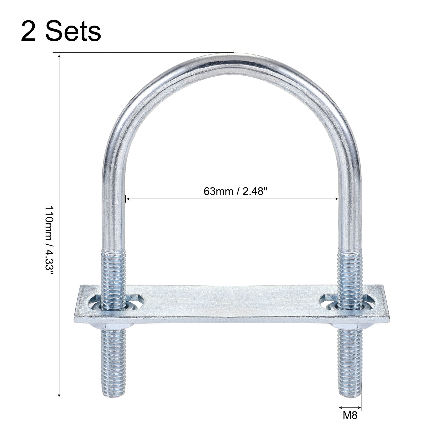 Specification: Product Name: U-Bolt Material: Steel Surface Treatment: Galvanized Main Color: Silver Tone Thread Dia.: M8 Fit Rod Size: 63mm / 2.48" Rod Diameter: 7mm / 0.28" Total Length: 110mm / 4.33" Hex Nut Size: 14 x 6mm / 0.55" x 0.24"(Hex Width*H) Frame Plate Size: 100 x 25 x 3mm / 3.94" x 0.98" x 0.12"(L*W*T)