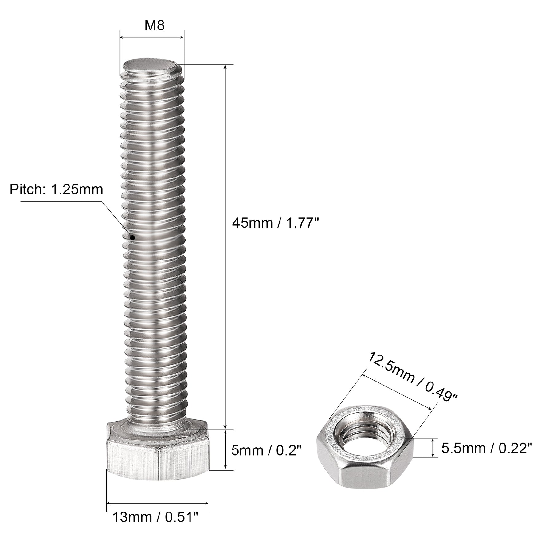 SizeName:M8 x 16mm SizeName:M8 x 20mm SizeName:M8 x 25mm Bolts and accessories are made of 304 stainless steel, which has higher hardness, corrosion resistance and rust resistance. Widely used in home and office appliances, communication equipment, mechanical assembly and other industrial equipment, and provide a firm fixing indoors and outdoors.