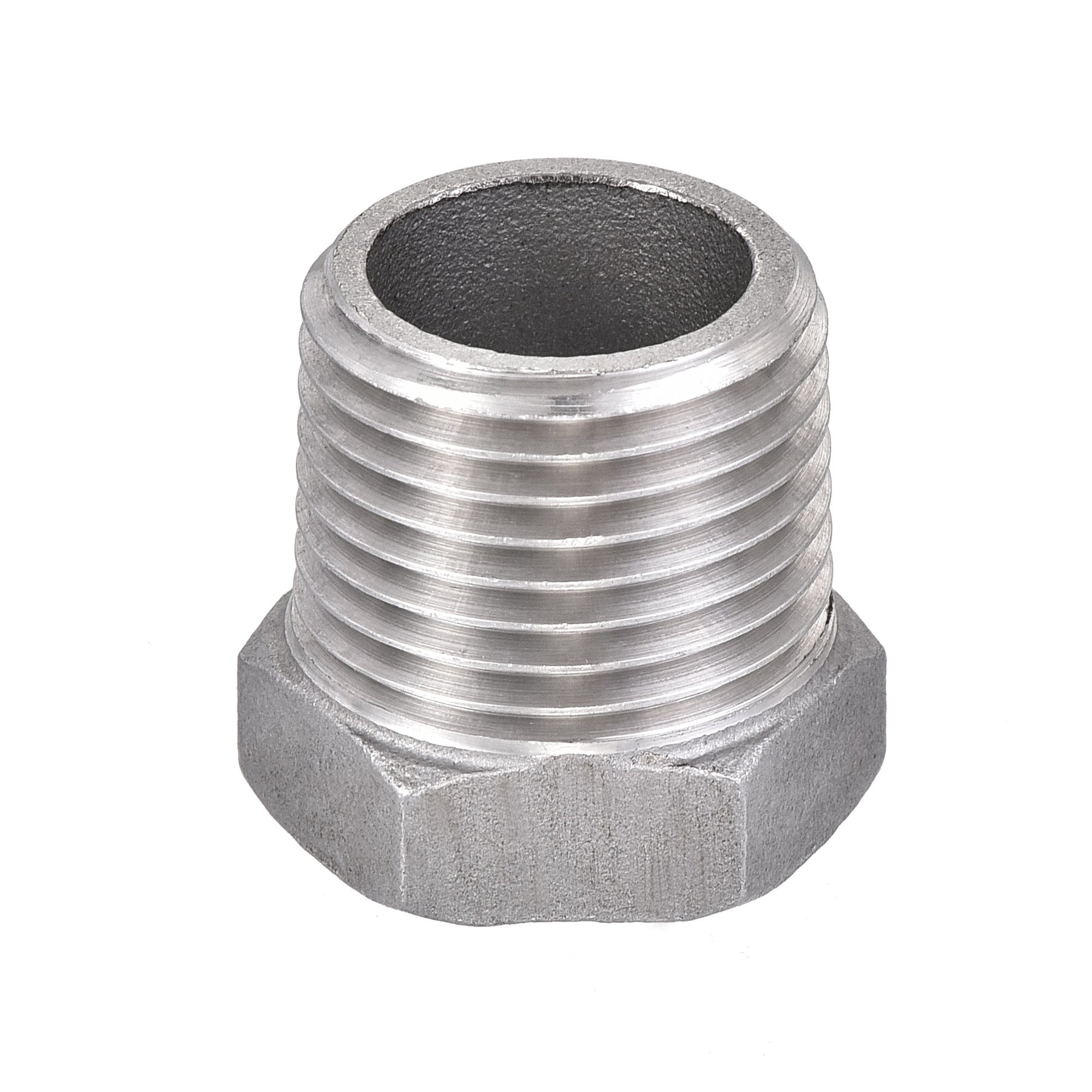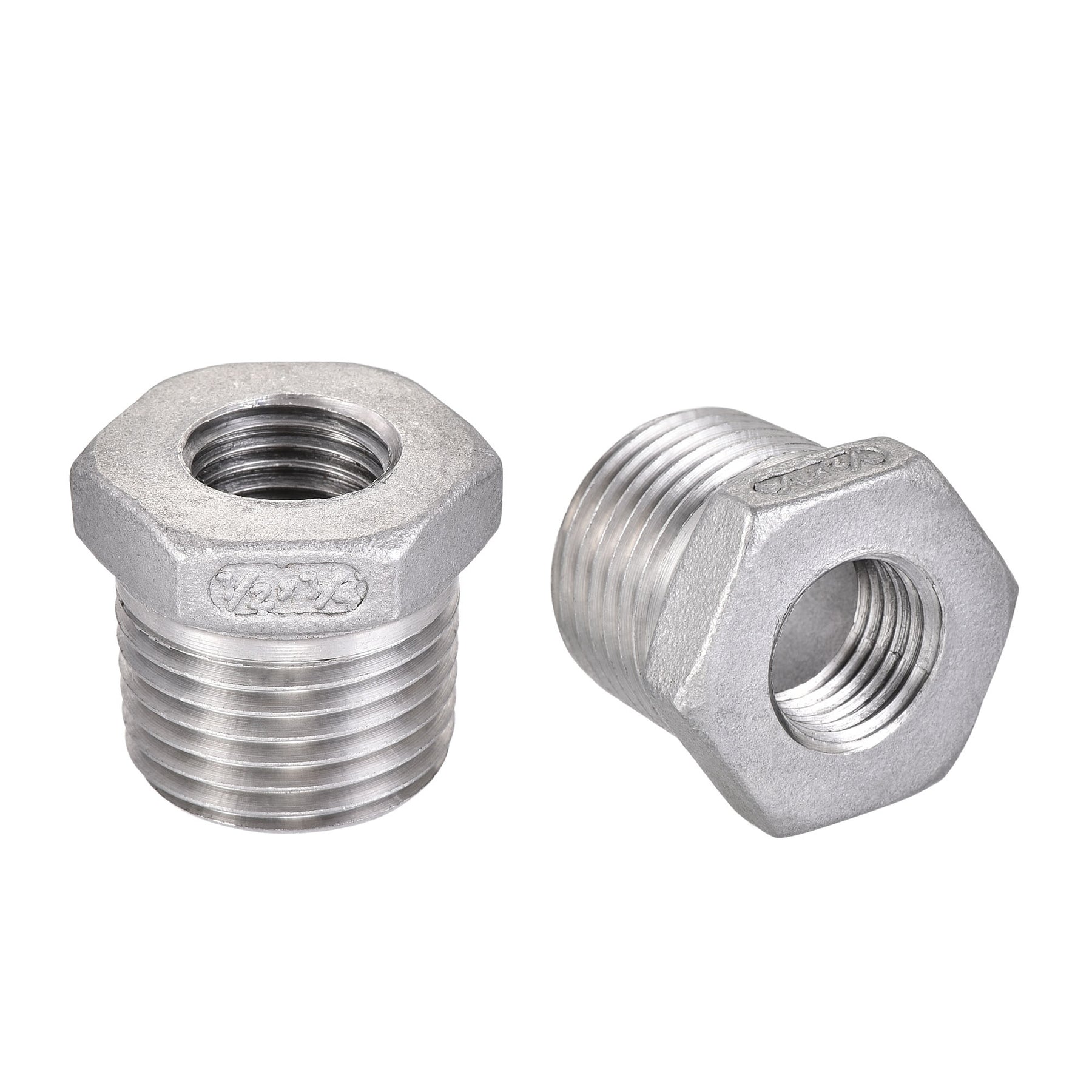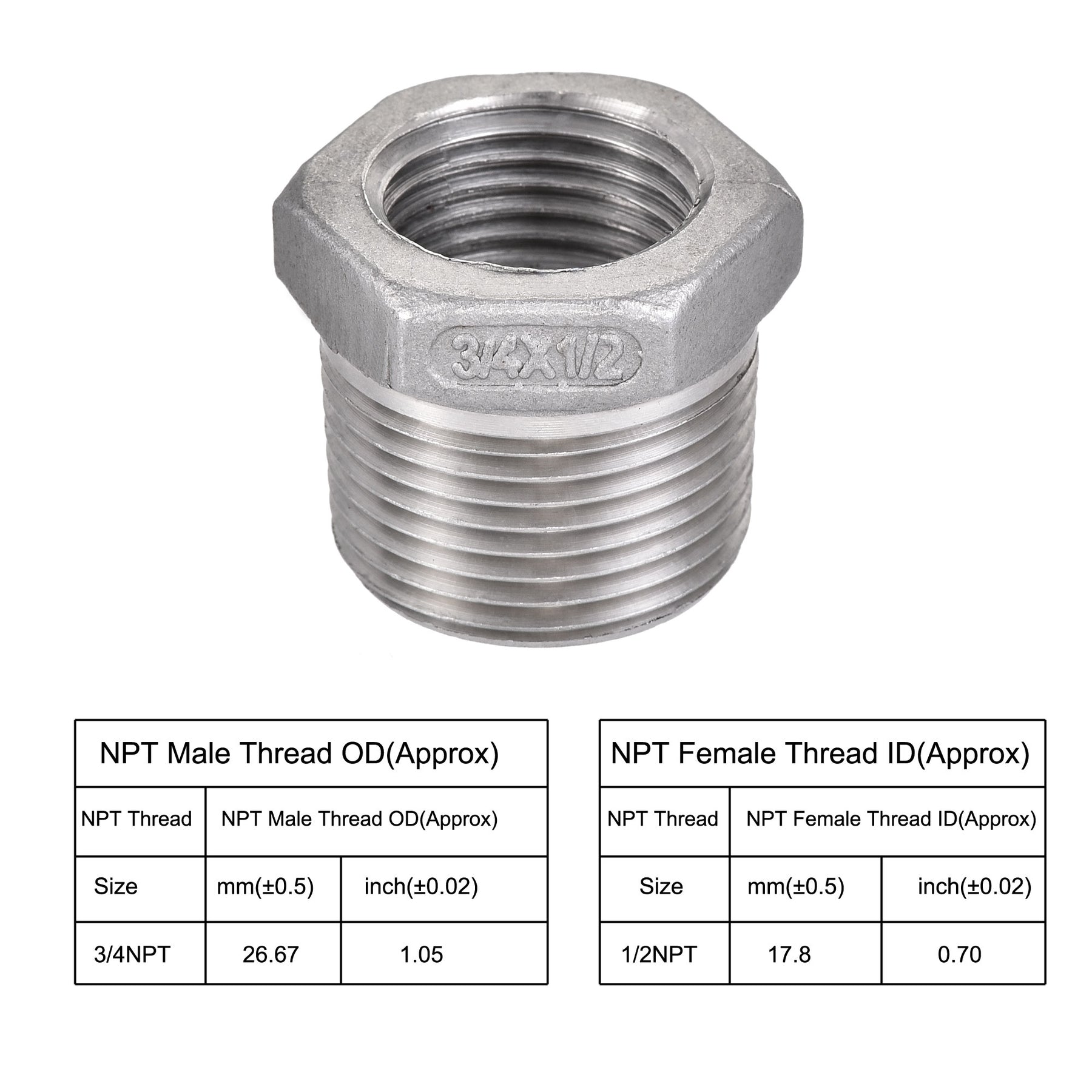 Size:1/2NPT x 1/4NPT Size:3/4NPT x 1/2NPT Size:1NPT x 1/2NPT Features: Used to connect pipes of two different thread sizes, reducing the pipe size from a larger to a smaller bore. Made of corrosion and rust resistant 304 stainless steel, even in wet environment for a long time, it still performs well. The reducer bushing has a hexagonal head, be easily controlled by the wrench, save more time to improve work efficiency. Widely used to connect faucet, sprinkler, garden hose, water pipe, oil tube, valve meter, air line, fuel pipe, engine, pressure gauge temp sensor, etc.