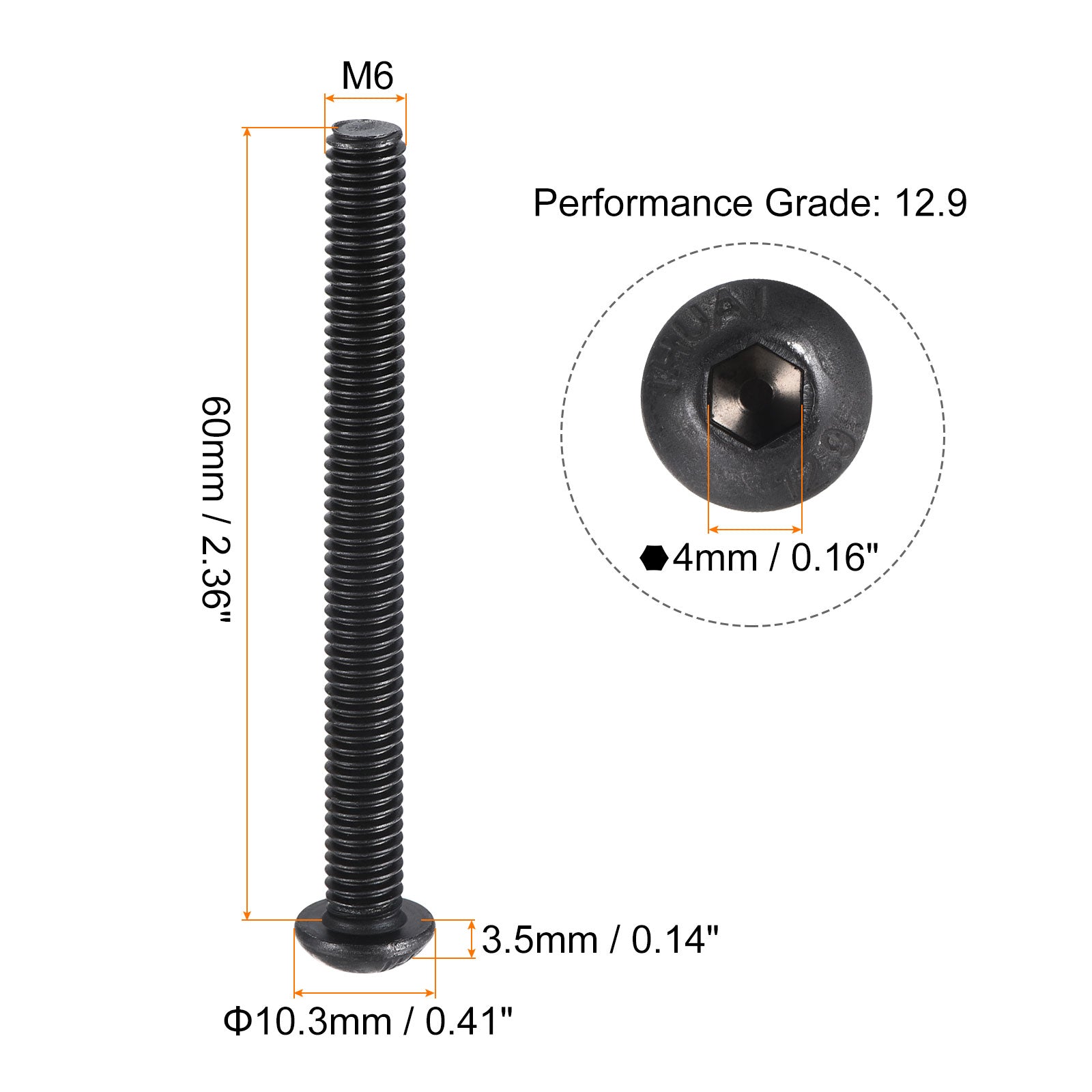 Specification: Product Name: Hex Socket Button Head Bolts Material: Alloy Steel Surface Treatment: Black Oxide Coating Performance Grade: 12.9 Color: Black Dimension: M6 x 60mm Rod Length(Under Head): 60mm / 2.36" Pitch: 1mm / 0.04" Inner Hex Width: 4mm / 0.16" Screw Head Size: 10.3 x 3.5mm / 0.41" x 0.14"(Dia.*Thickness)