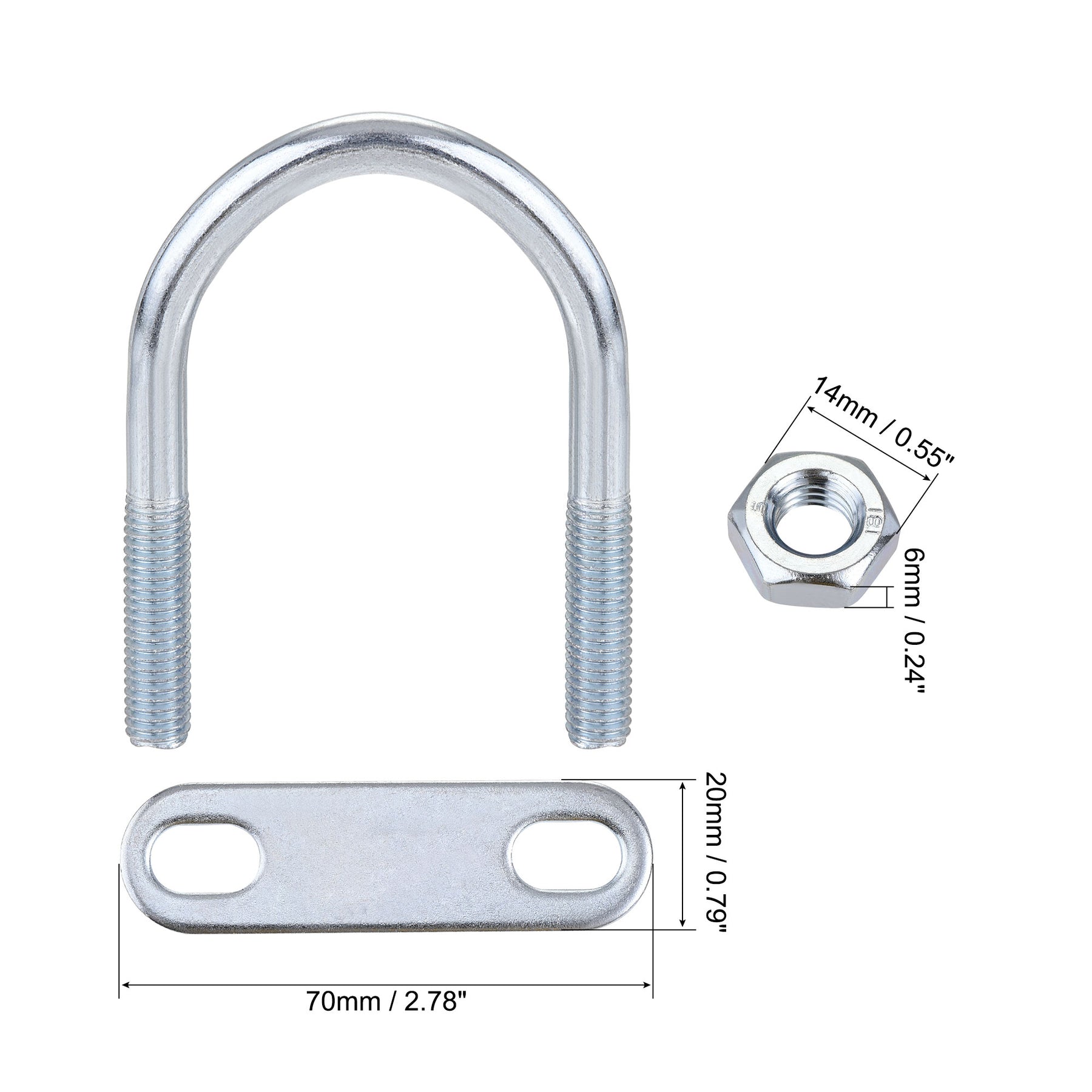 Specification: Product Name: U-Bolt Material: Steel Surface Treatment: Galvanized Main Color: Silver Tone Thread Dia.: M8 Fit Rod Size: 42mm /1.65" Rod Diameter: 7mm / 0.28" Total Length: 75mm / 2.95" Hex Nut Size: 14 x 6mm / 0.55" x 0.24"(Hex Width*H) Frame Plate Size: 70 x 20 x 2mm / 2.76" x 0.79" x 0.08"(L*W*T)