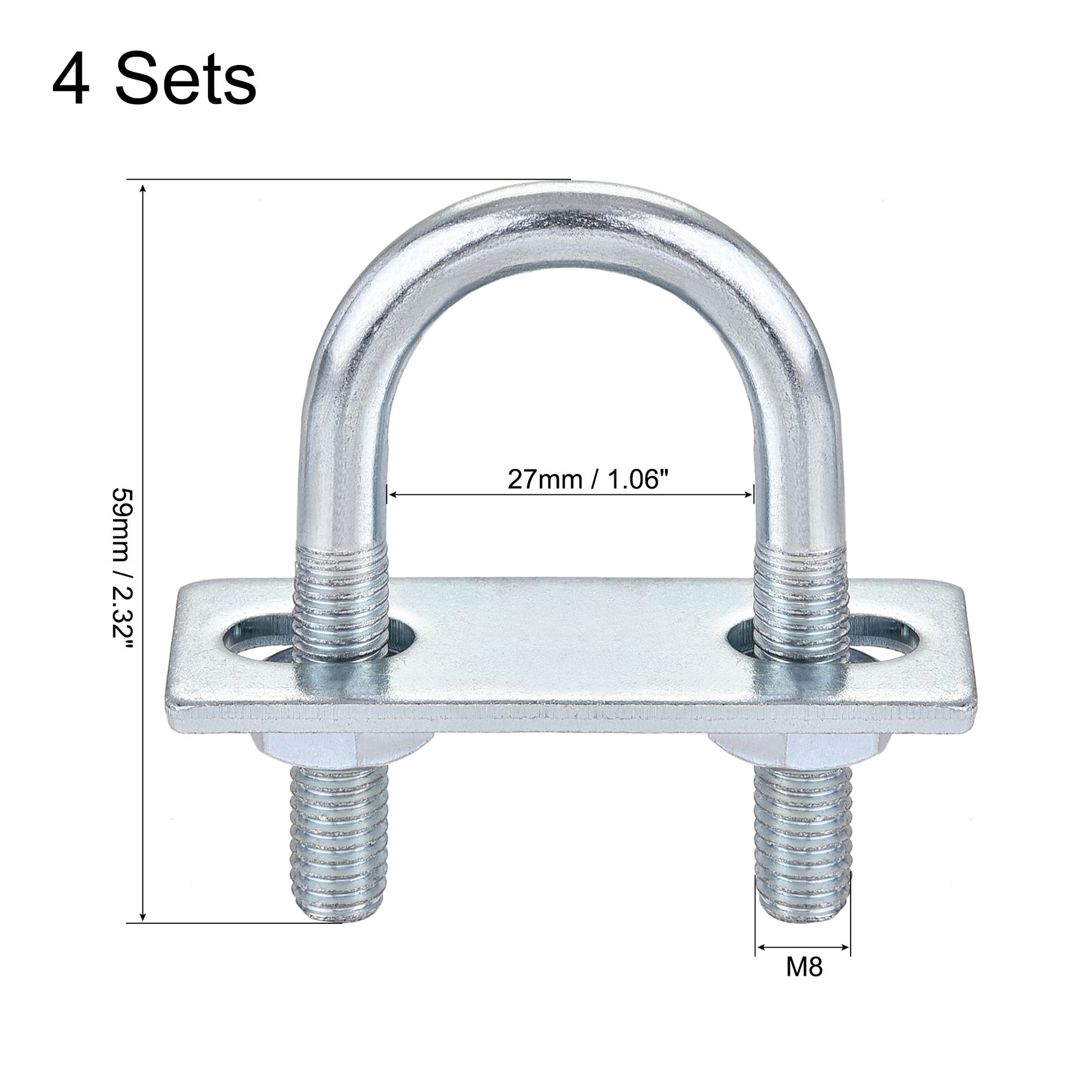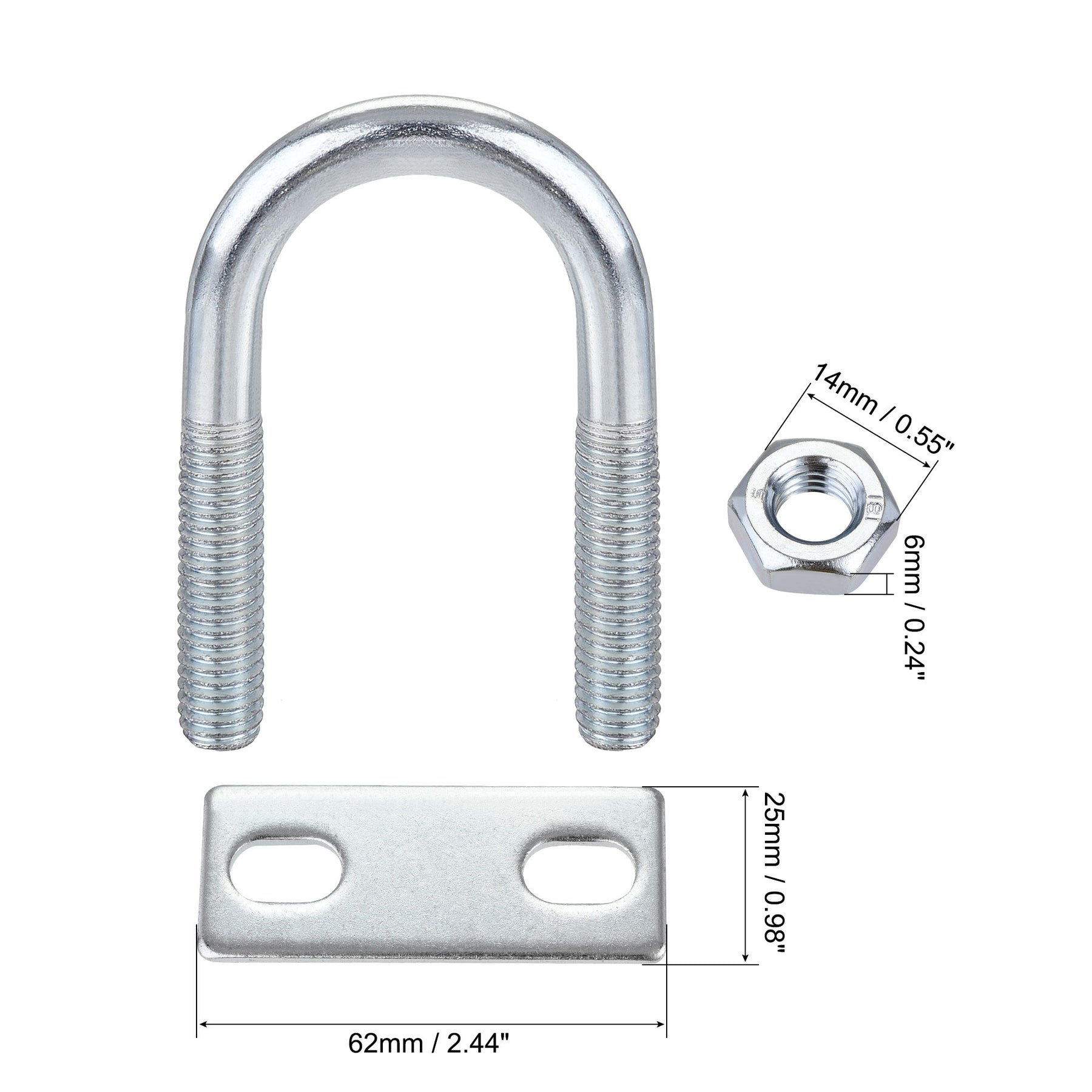 Specification: Product Name: U-Bolt Material: Steel Surface Treatment: Galvanized Main Color: Silver Tone Thread Dia.: M8 Fit Rod Size: 27mm / 1.06" Rod Diameter: 7mm / 0.28" Total Length: 59mm / 2.32" Hex Nut Size: 14 x 6mm / 0.55" x 0.24"(Hex Width*H) Frame Plate Size: 62 x 25 x 3mm / 2.44" x 0.98" x 0.12"(L*W*T)