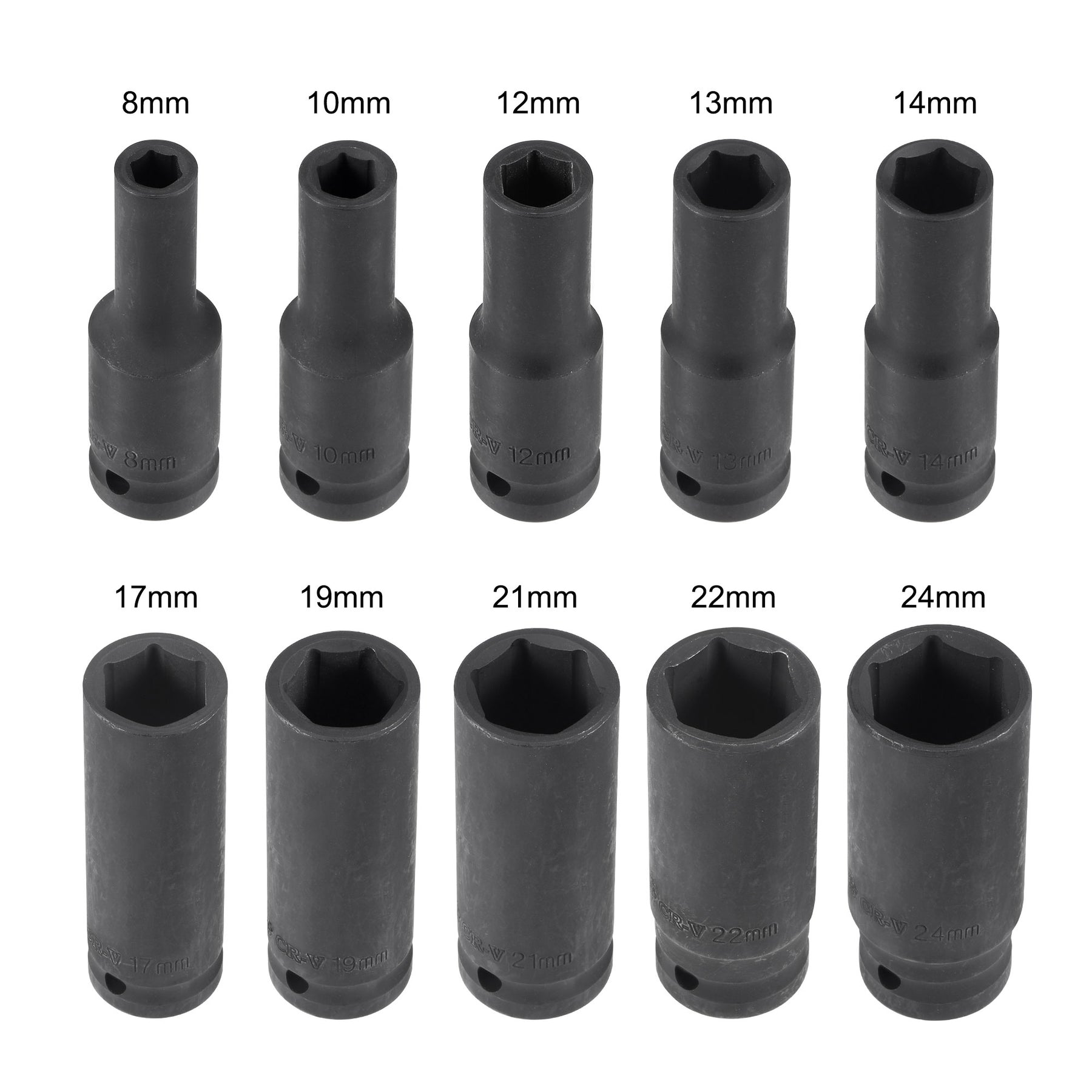 Specifications: * Socket Size: 8mm/10mm/12mm/13mm/14mm/17mm/19mm/21mm/22mm/24mm * Drive Size: 1/2-inch * Total Length: 78mm / 3-inch * Material: Chrome-Molybdenum Steel (CR-MO) * Finish: Black Phosphate * Color: Black