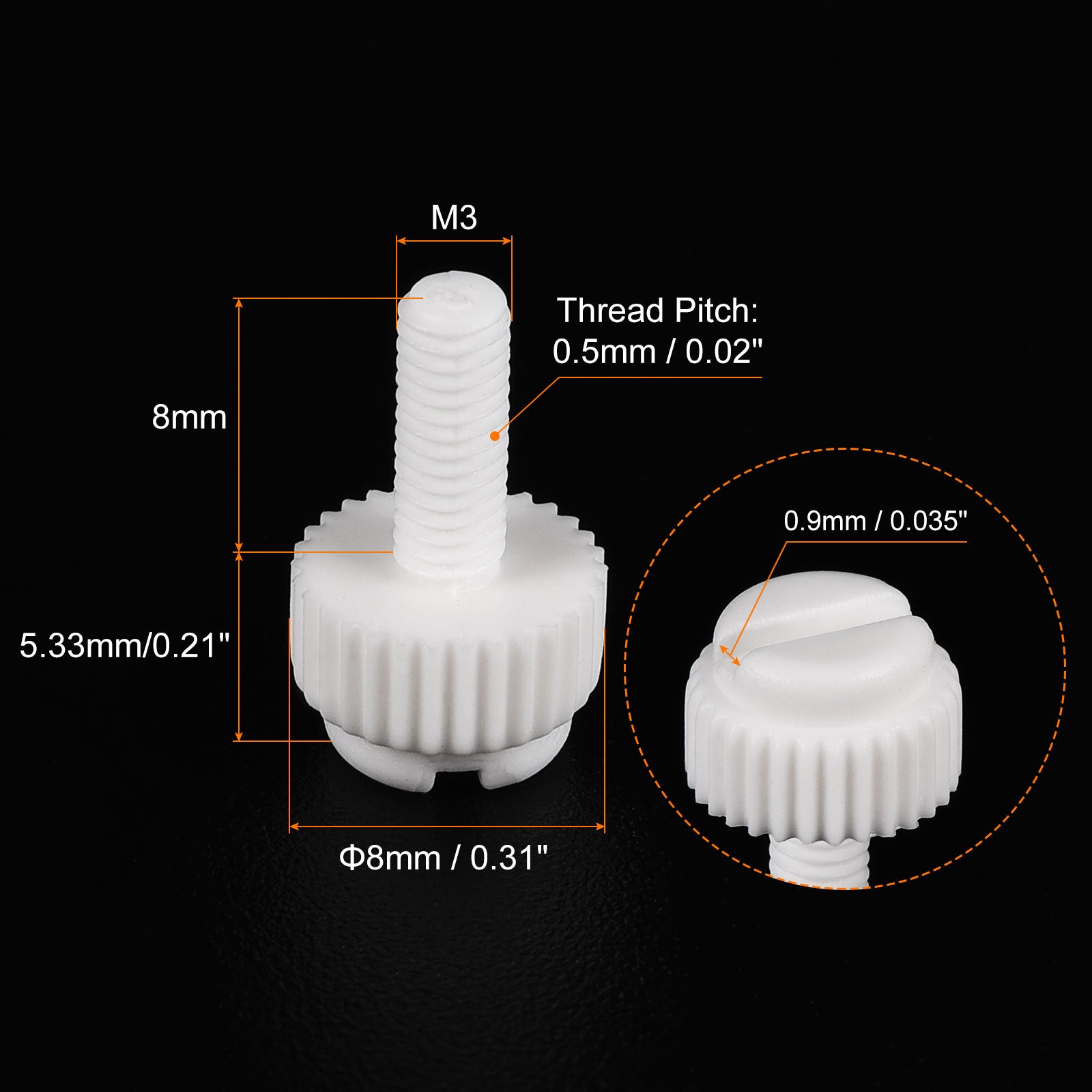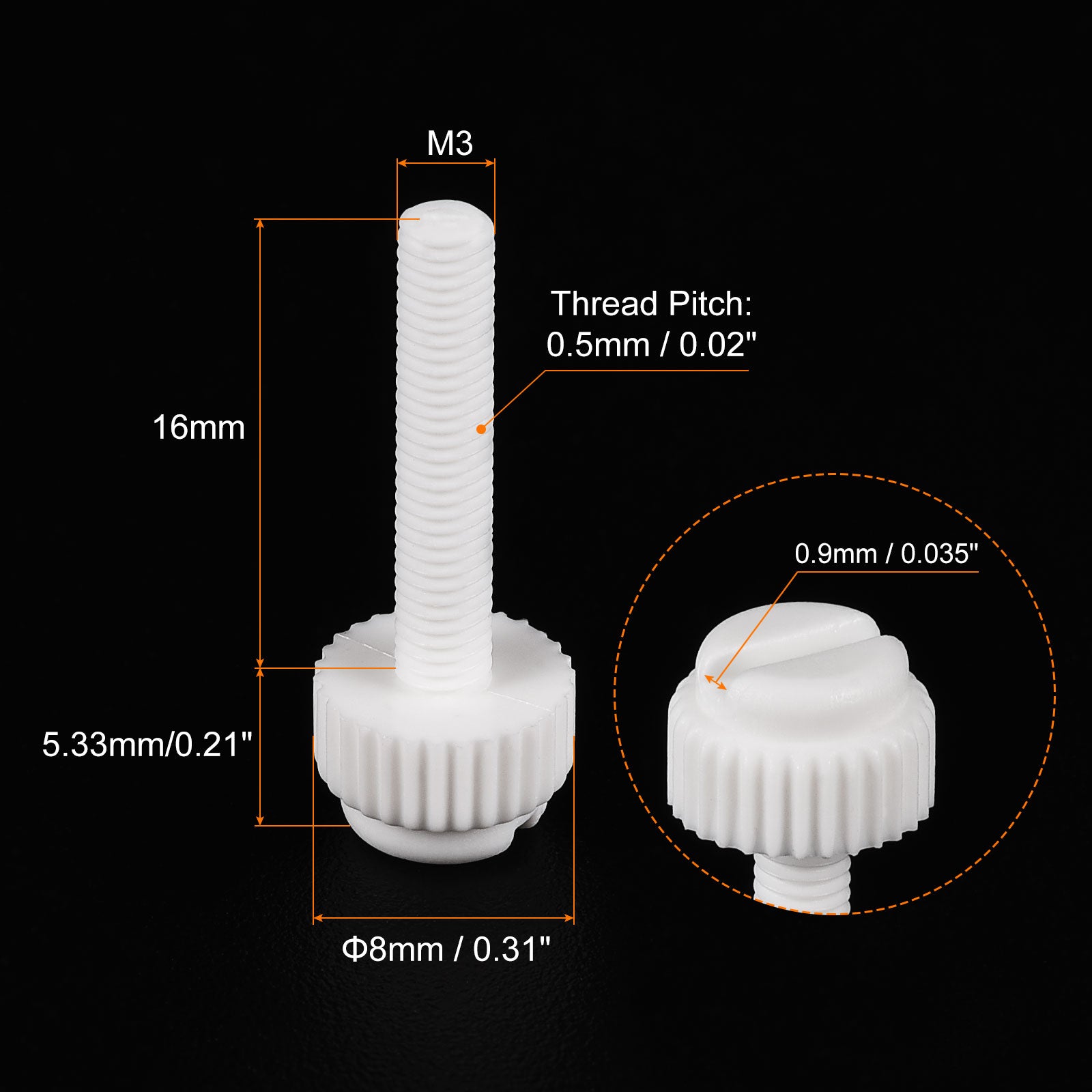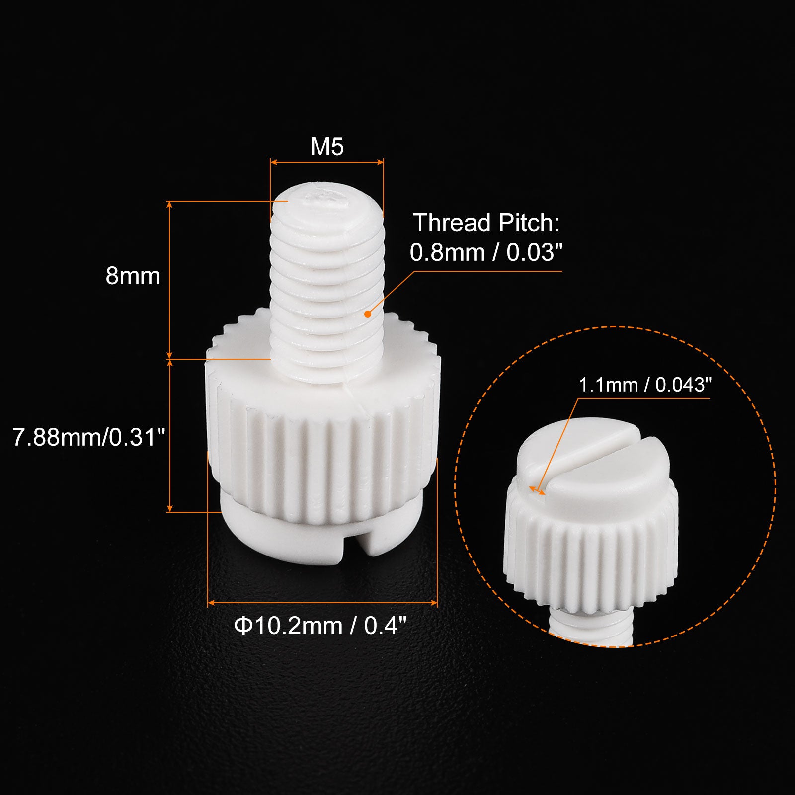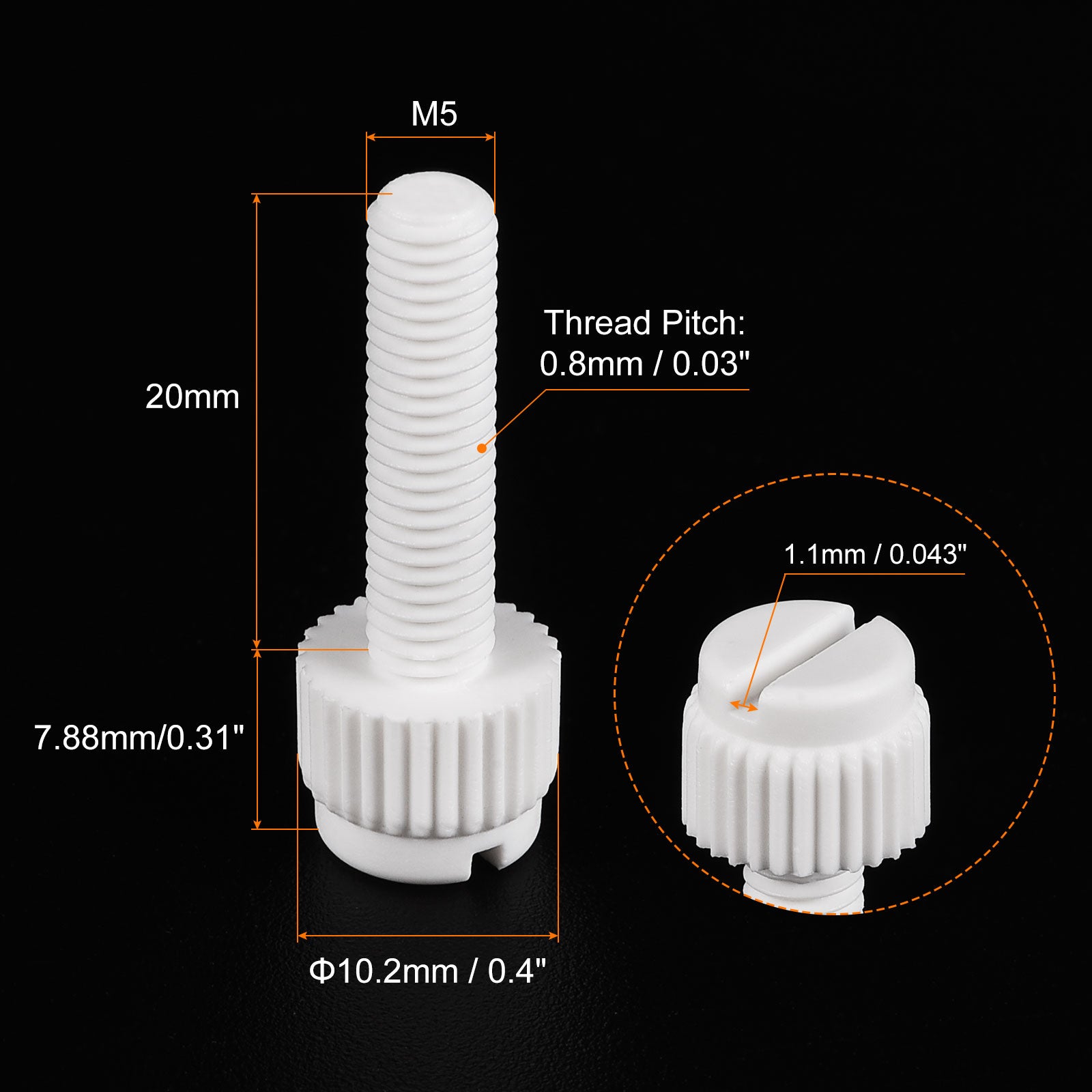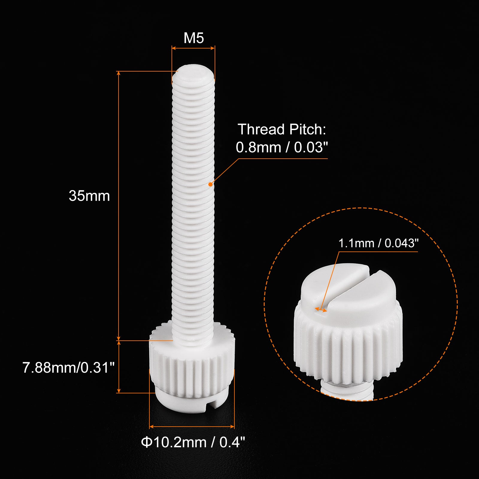 Specification: Color: White Material: PP Plastic Thread Size: M5x35mm Thread Pitch: 0.8mm/ 0.03" Drive Type: Slotted Drive Head Style: Slotted Knurled Head Screw Head Size: 10.2 x7.88mm/ 0.4" x0.31"(D*T)
