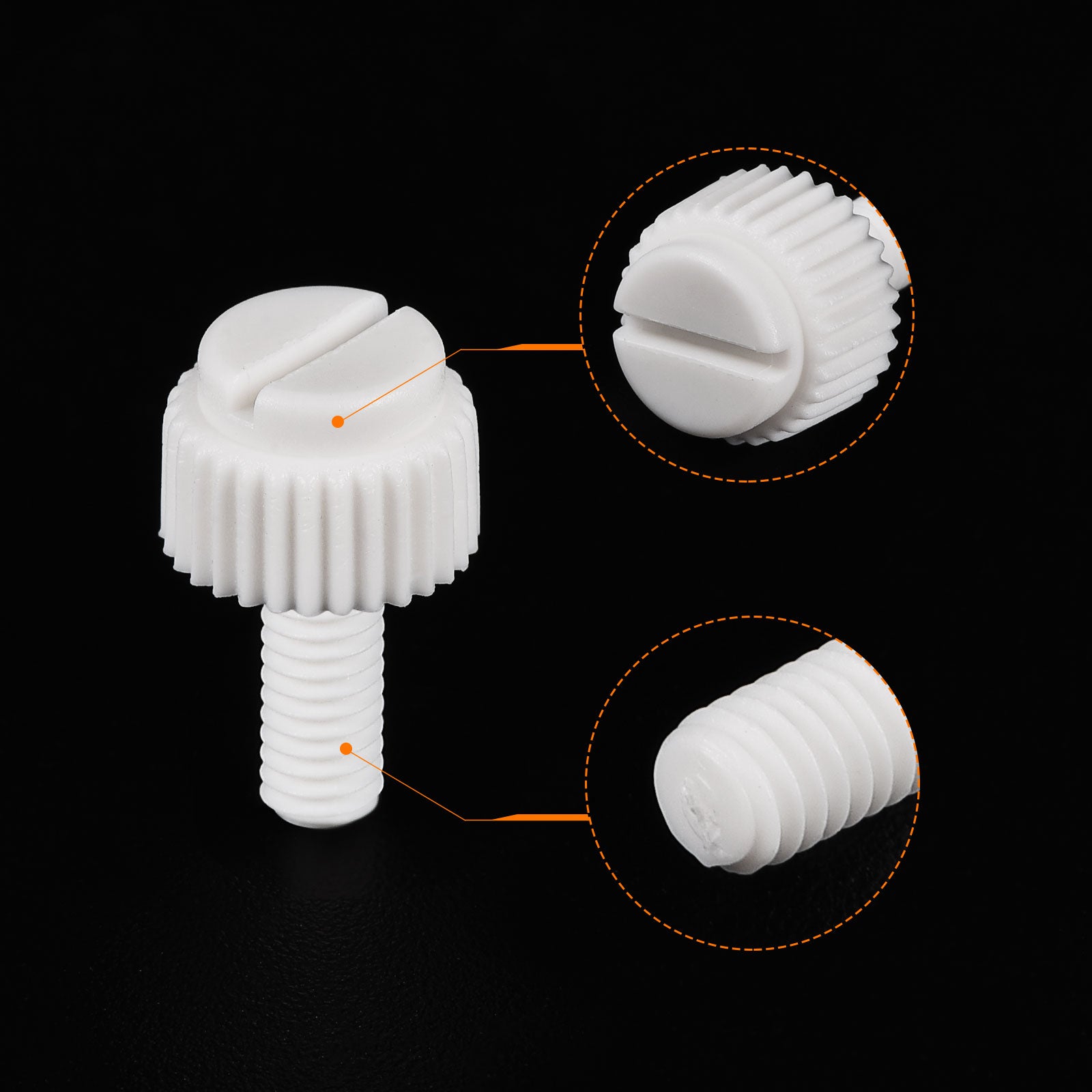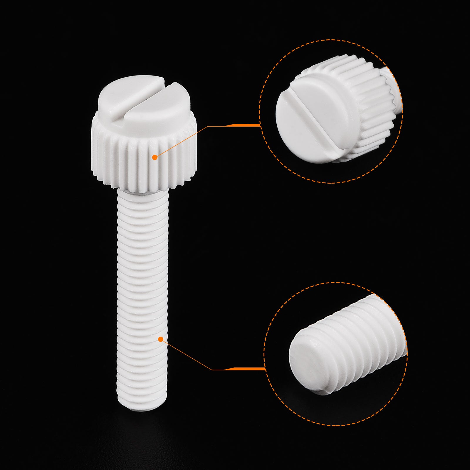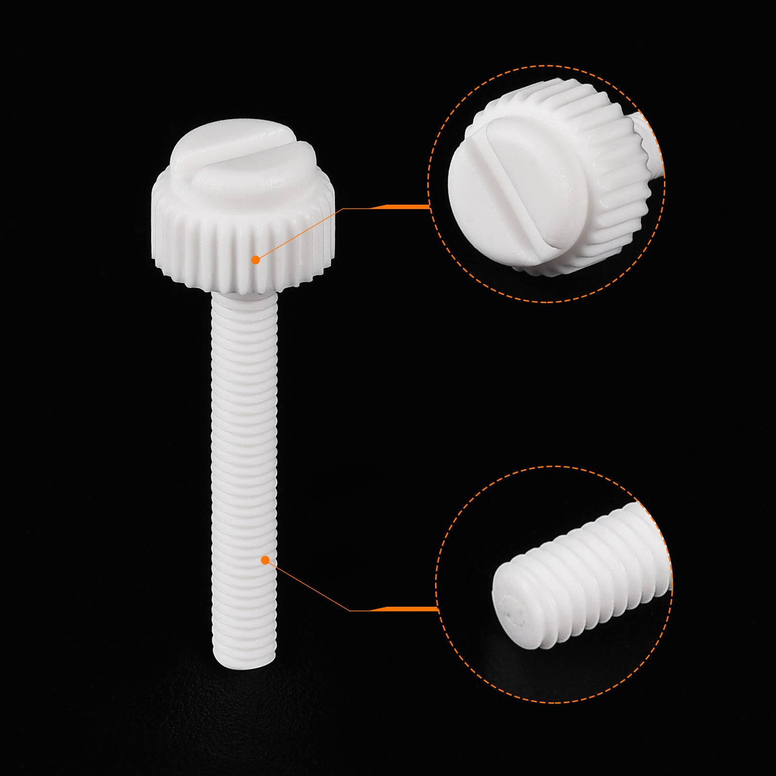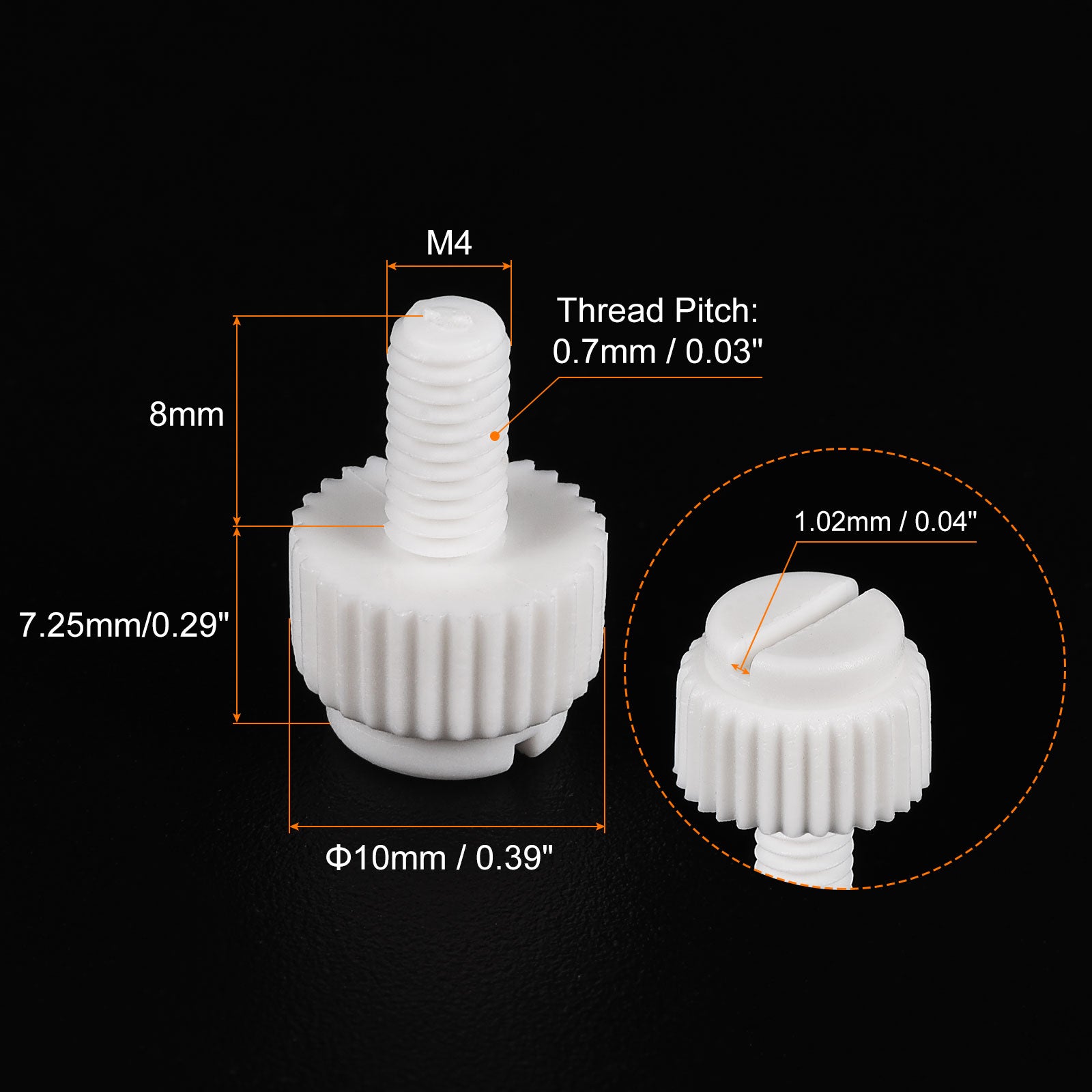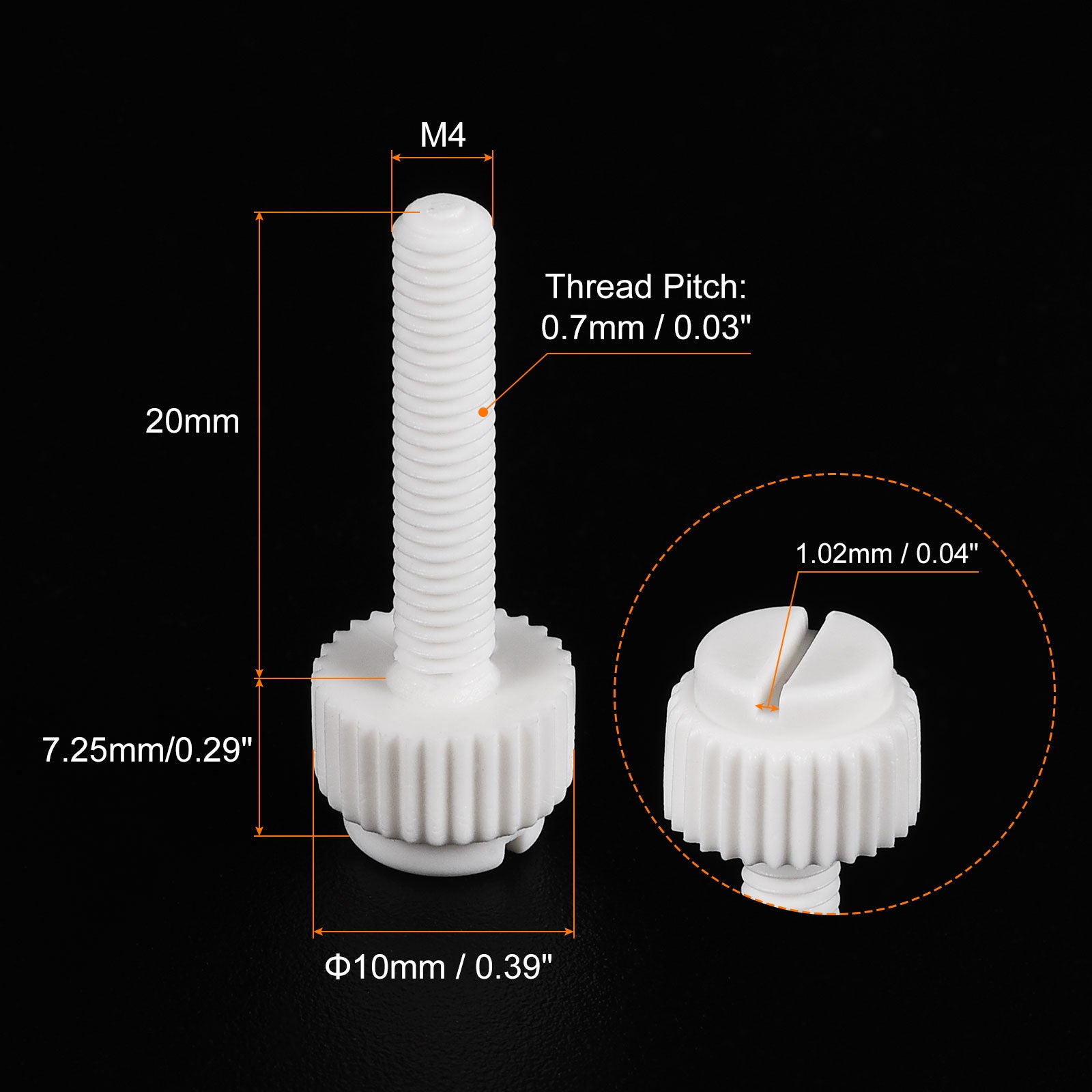 Specification: Color: White Material: PP Plastic Thread Size: M5x35mm Thread Pitch: 0.8mm/ 0.03" Drive Type: Slotted Drive Head Style: Slotted Knurled Head Screw Head Size: 10.2 x7.88mm/ 0.4" x0.31"(D*T)