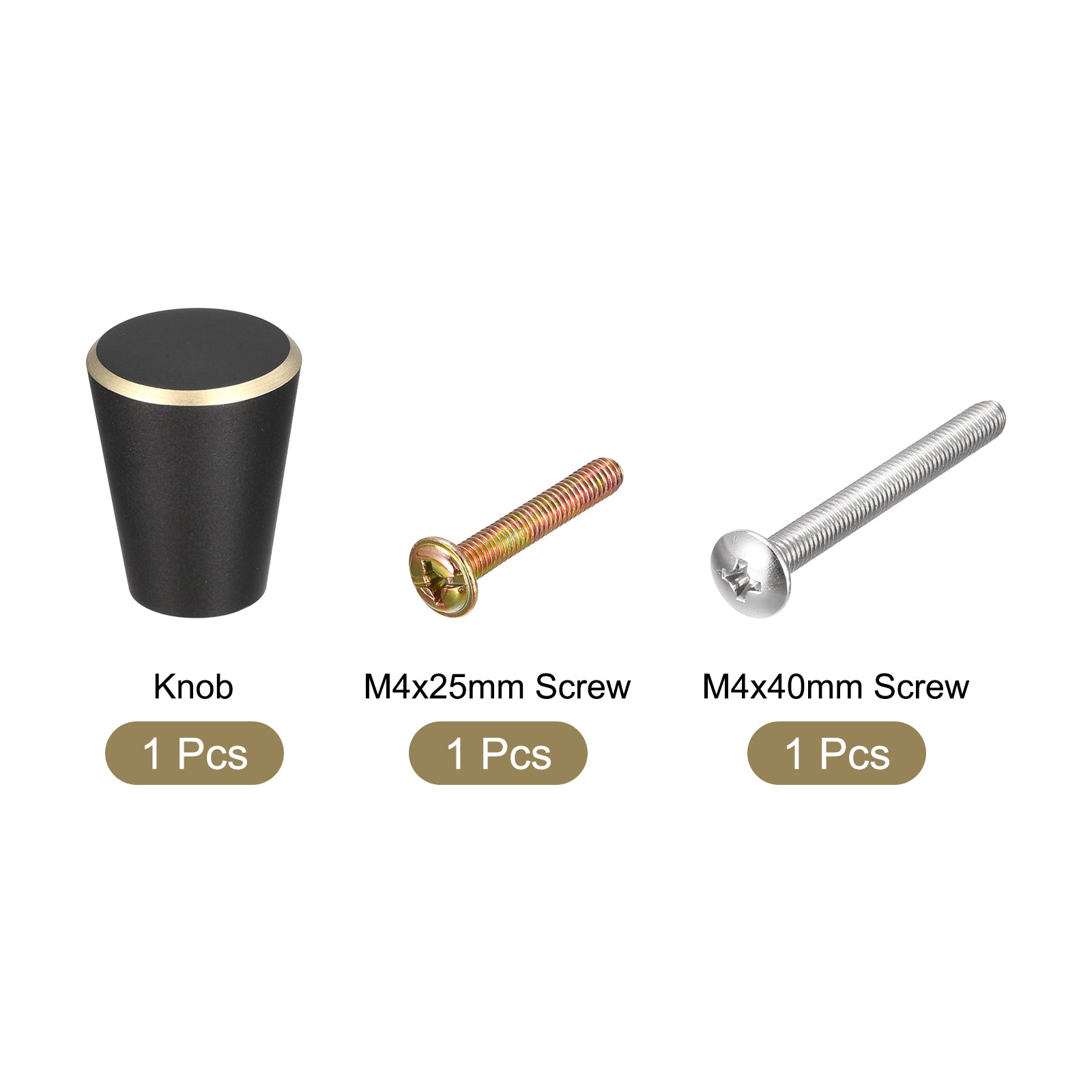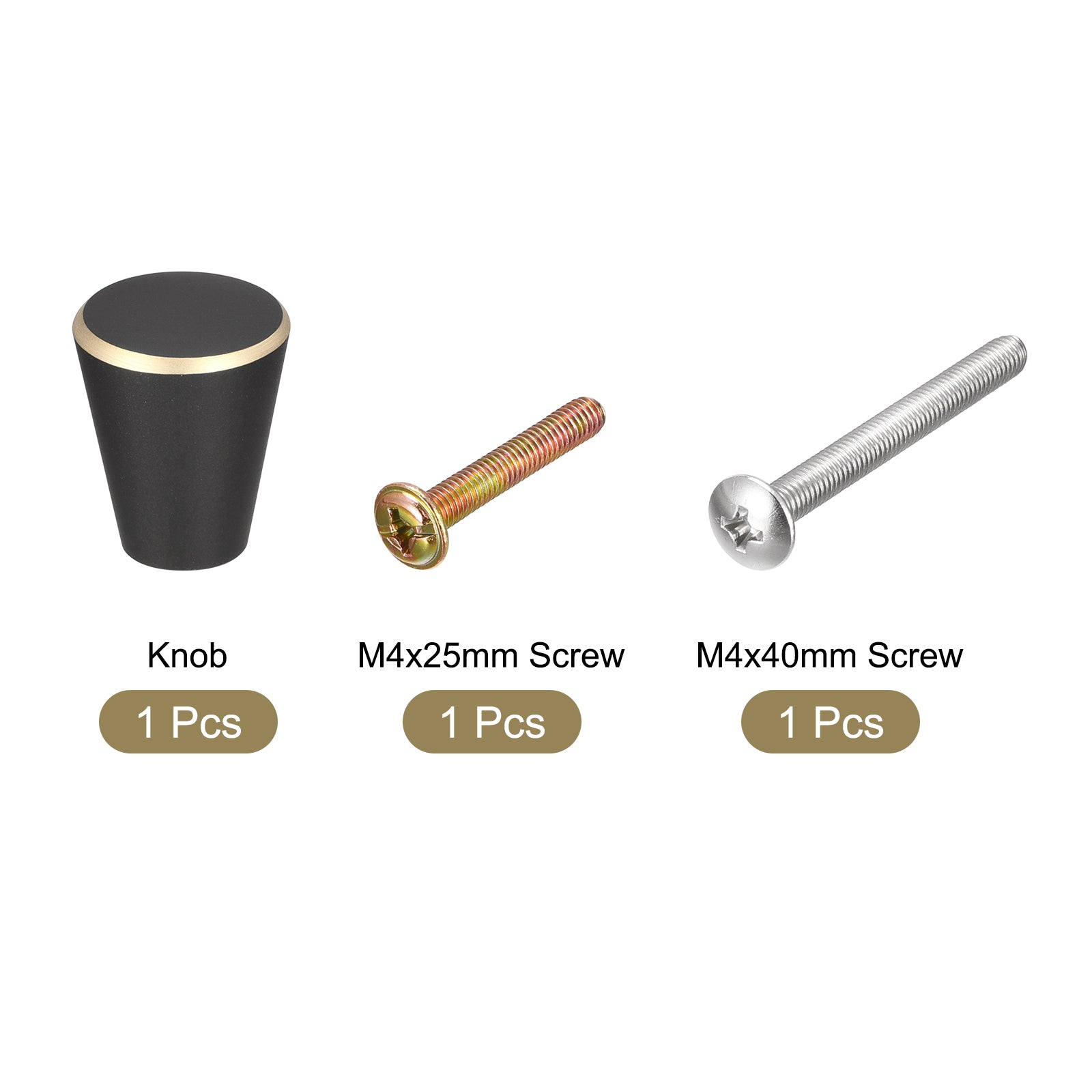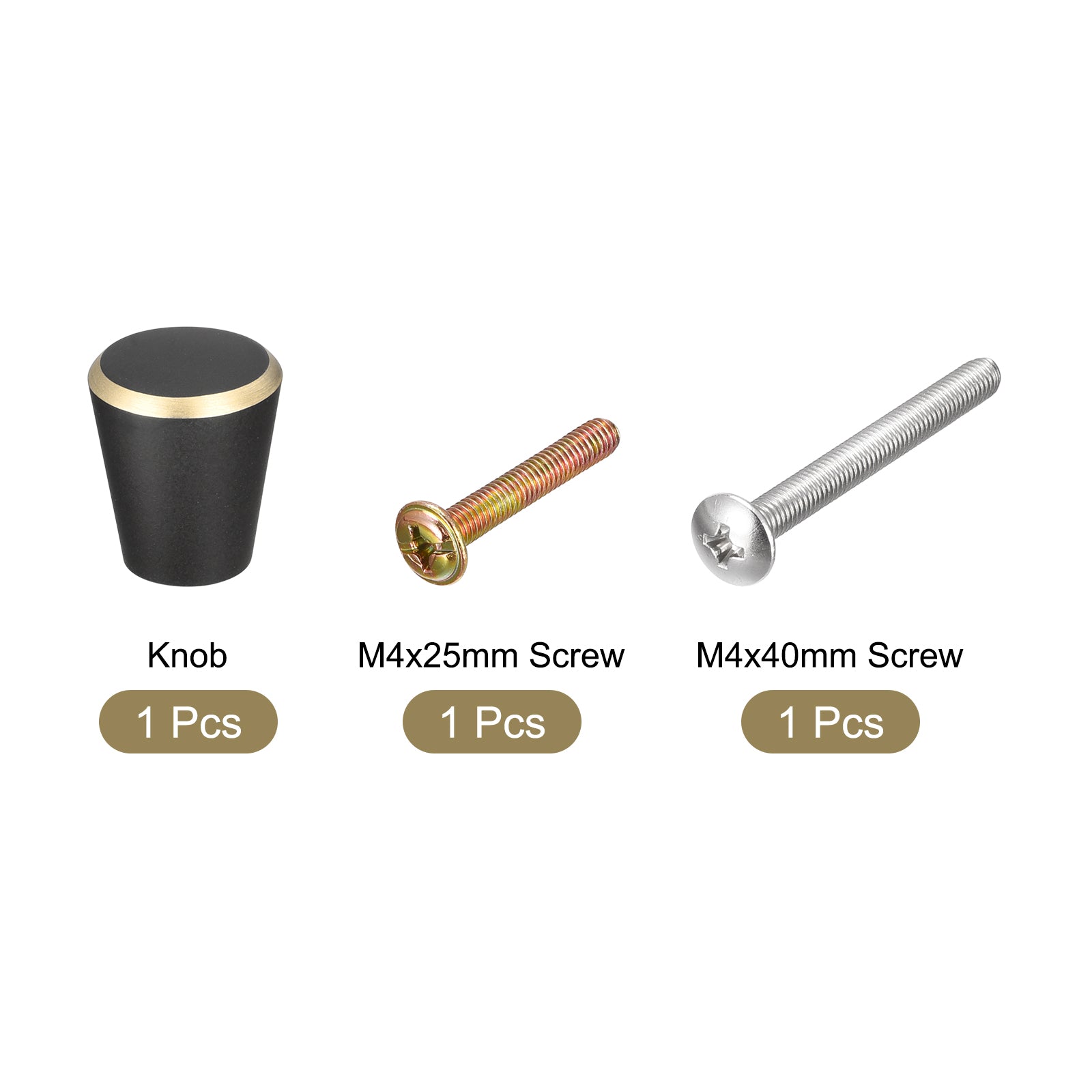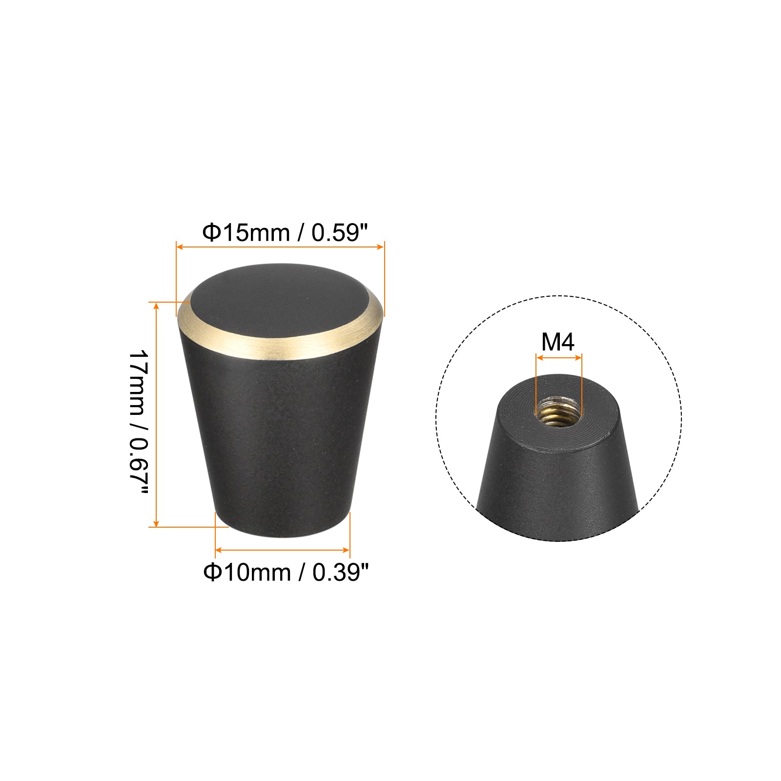 Specifications: Product Name: Drawer Knobs Knobs Material: Brass Knobs Finish: Baking Varnish Screw Material: 304 Stainless Steel Color: Black + Gold Edge Base Diameter: 10mm / 0.39" Total Size: 15 x 17mm / 0.59"x 0.67"(Max. W*H) Screw Size: M4 x 25mm, M4 x 40mm