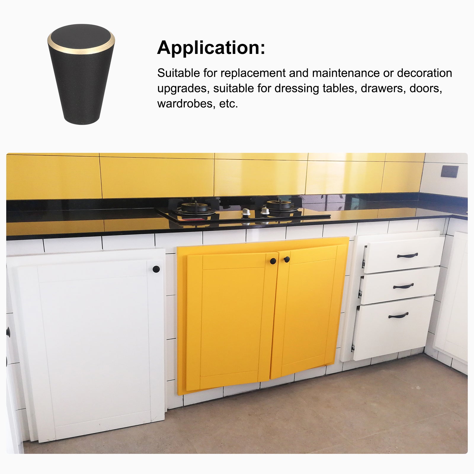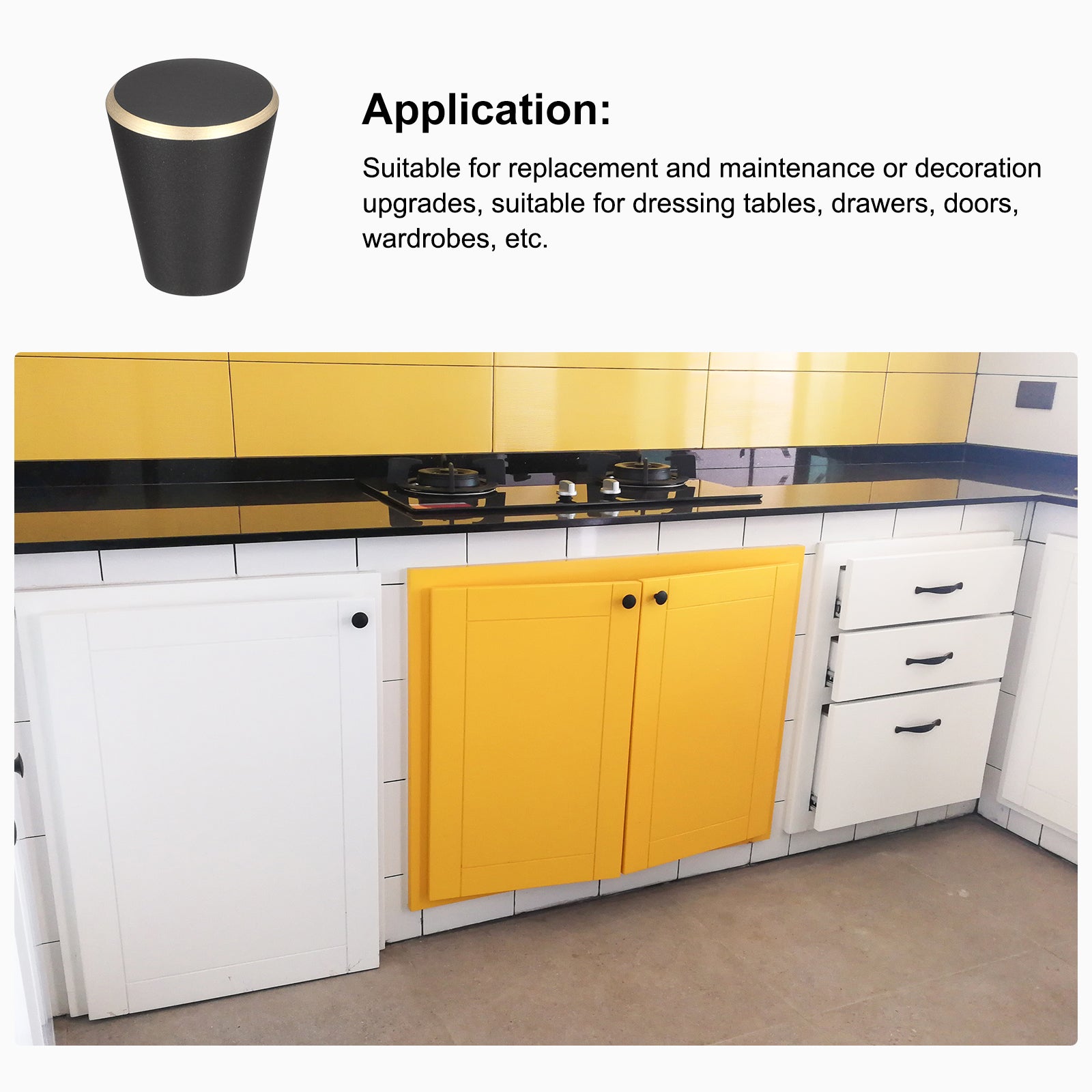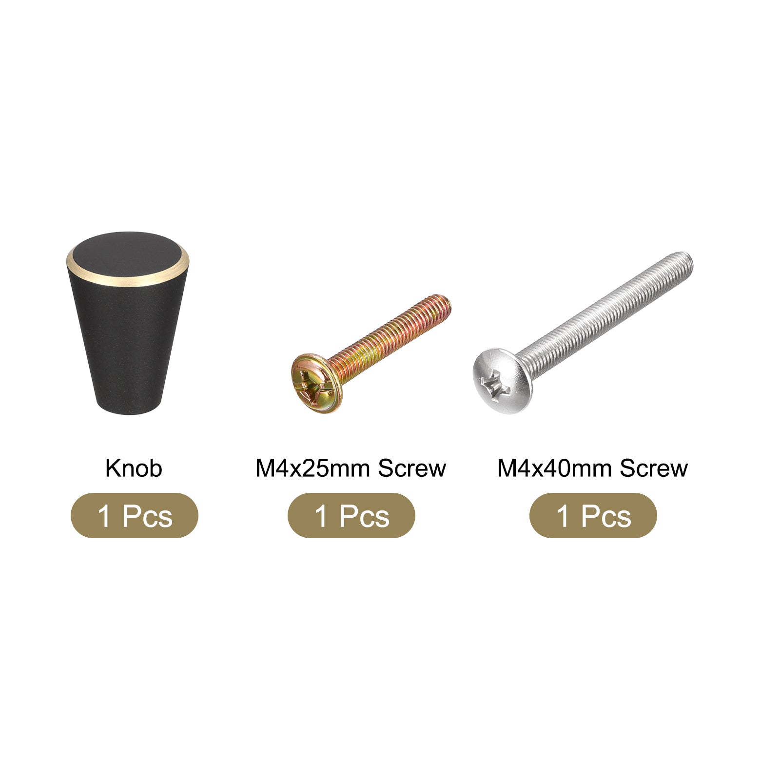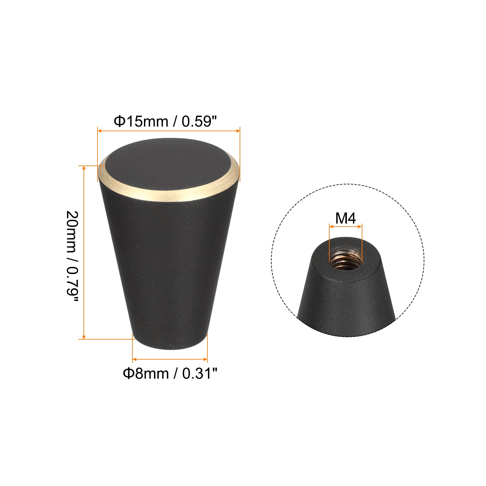 Specifications: Product Name: Drawer Knobs Knobs Material: Brass Knobs Finish: Baking Varnish Screw Material: 304 Stainless Steel Color: Black + Gold Edge Base Diameter: 10mm / 0.39" Total Size: 15 x 17mm / 0.59"x 0.67"(Max. W*H) Screw Size: M4 x 25mm, M4 x 40mm