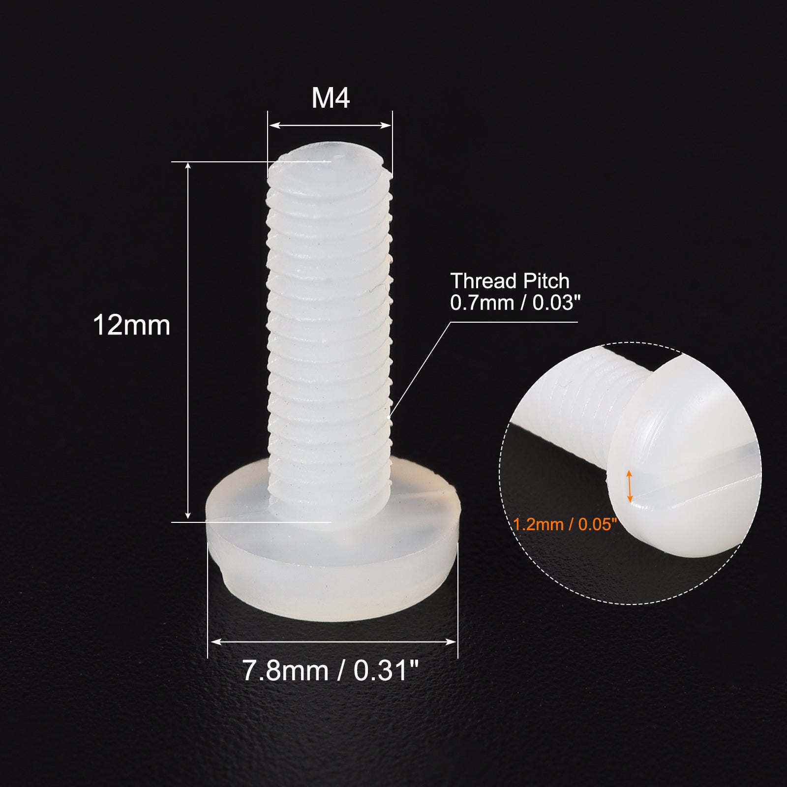 Specification: Material: Nylon Drive Type: Slotted Drive Thread Size: M4 x 12mm Thread Pitch: 0.7mm / 0.03" Screw Head Size: 7.8 x 2.3mm / 0.31" x 0.09"(D*T) Package Content: 40pcs x Nylon Machine Screws