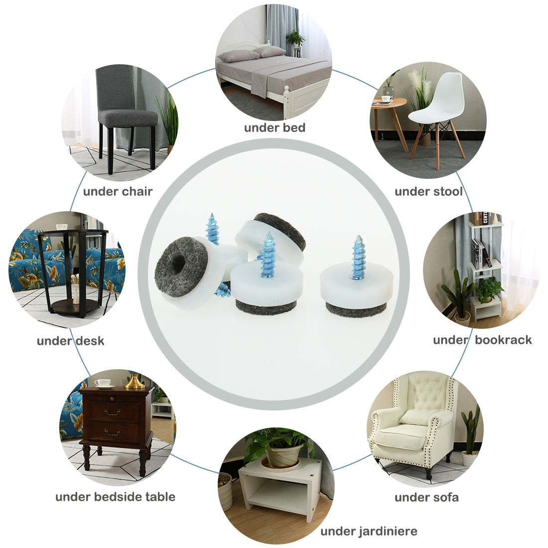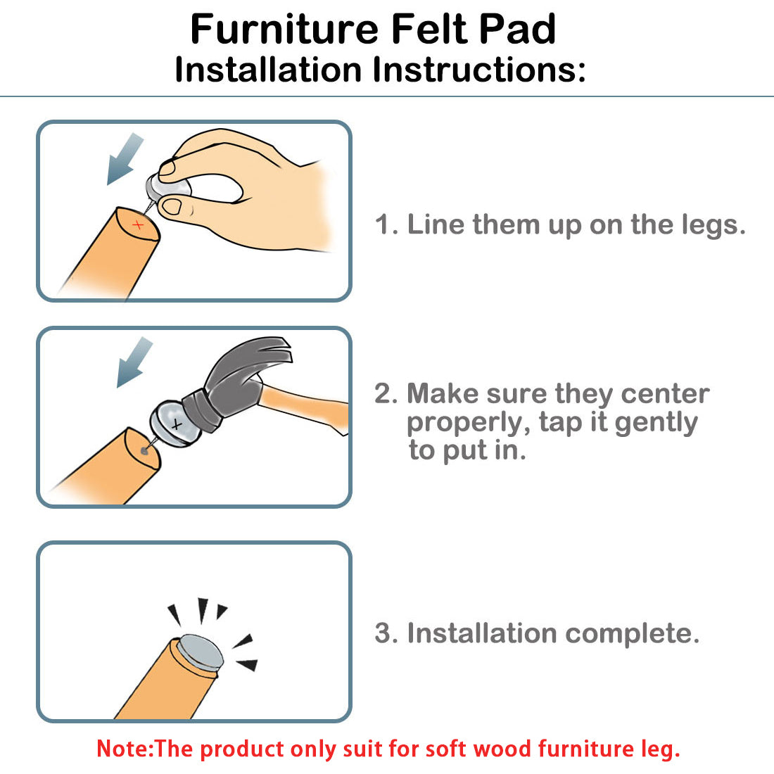 Tips: 1. You need to draw an X line at the bottom of the foot of the furniture to find the center point of the bottom, then make a hole to install it. 2. Inspect the felt pad nail regularly, replace the bad one in time, and protect the floor better.