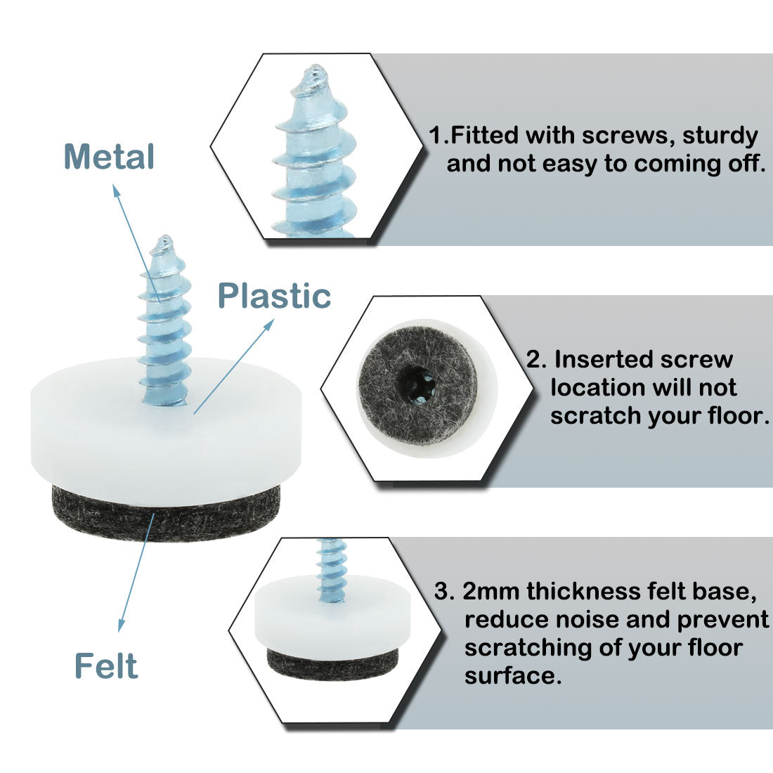 Total Size: 20 x 21mm/0.79 Inch x 0.83 Inch(D*H) Felt Diameter: 16mm/0.63 Inch Base Height(Felt + Plastic): 8mm/0.31 Inch Screw Size: 13 x 4mm/0.51 Inch x 0.16 Inch(L*D)