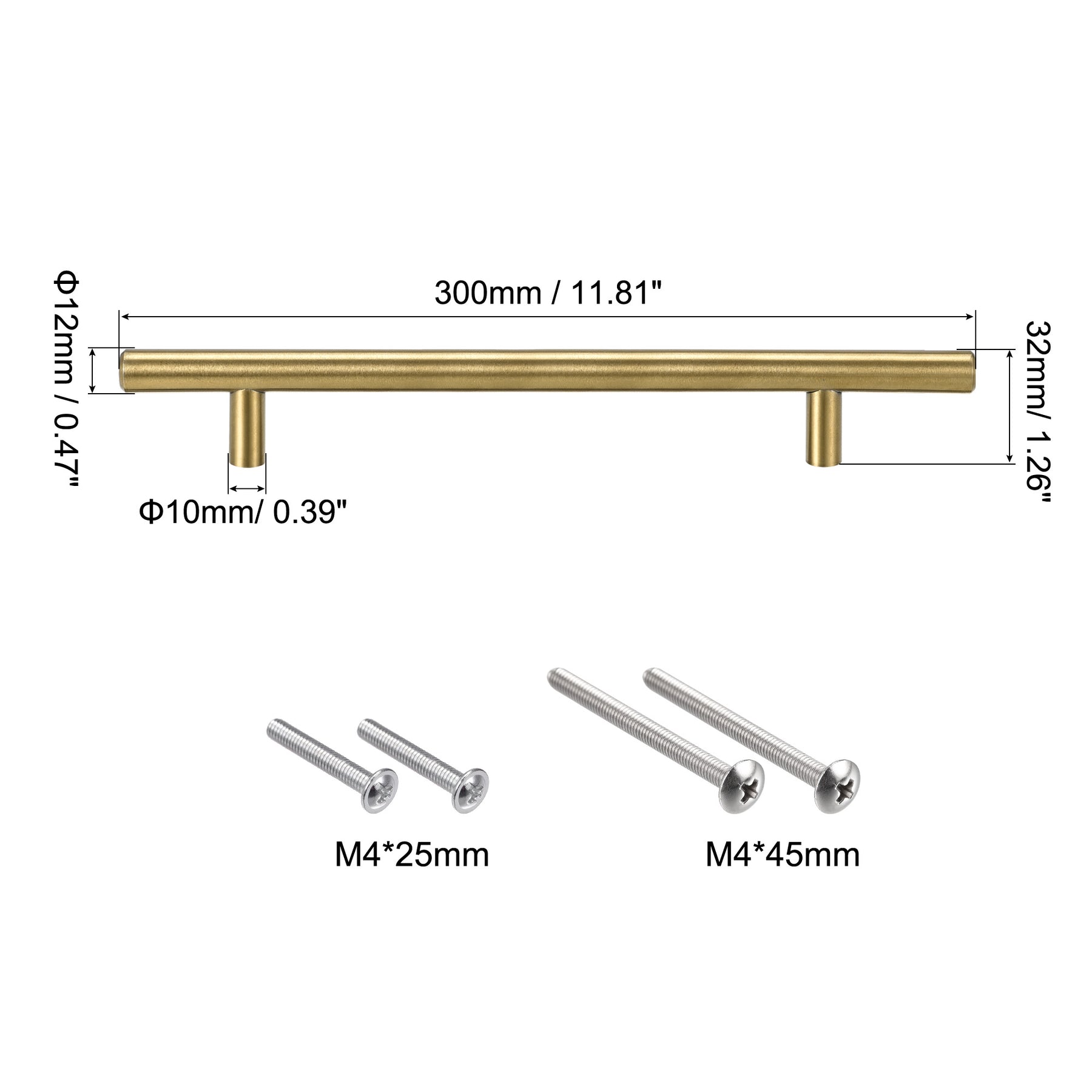 Specification: Material: Stainless Steel Finish: Electroplated Total Size: 300 x 32mm / 11.81" x 1.26"(L*H) T Bar Diameter: 12mm / 0.47" Base Diameter: 10mm/ 0.39" Mounting Hole Size: M4 Mounting Hole Center Distance: 192mm / 7.56" Package Content: 1 x T Bar Pull Handle; 2 x M4*25mm Screw; 2 x M4*45mm Screw