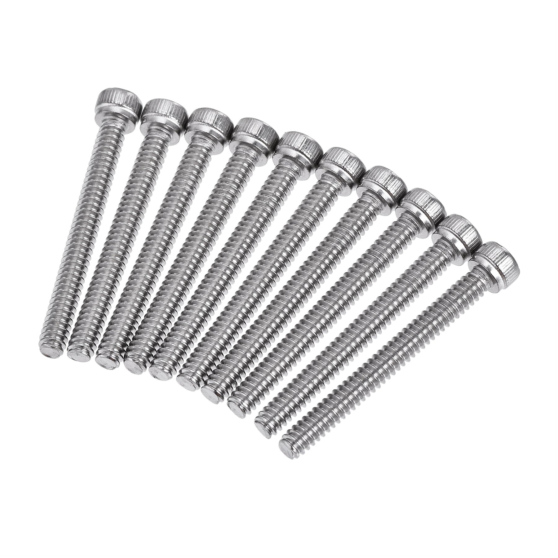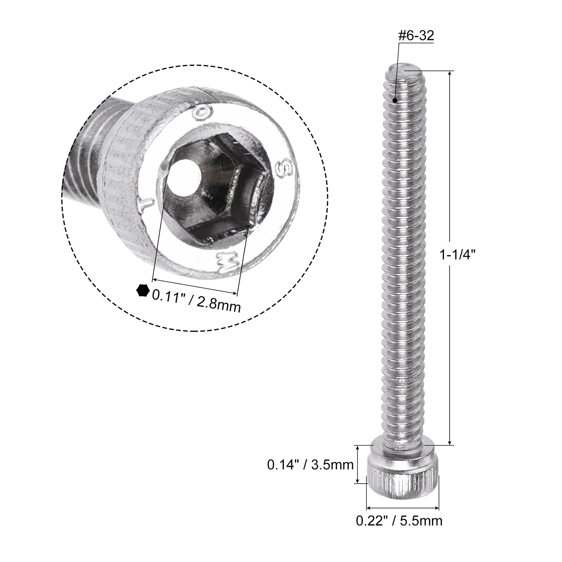 Specification: Product Name: Hex Socket Head Bolt Color: Silver Tone Material: 304 Stainless Steel Surface Treatment: Polished Processing Technology: Cold Forging+Thread Rolling Thread Diameter: #6-32 Screw Length: 1-1/4" Head Size: 5.5 x 3.5mm / 0.22" x 0.14"(D*H) Hex Socket Head Width: 2.8mm / 0.11"