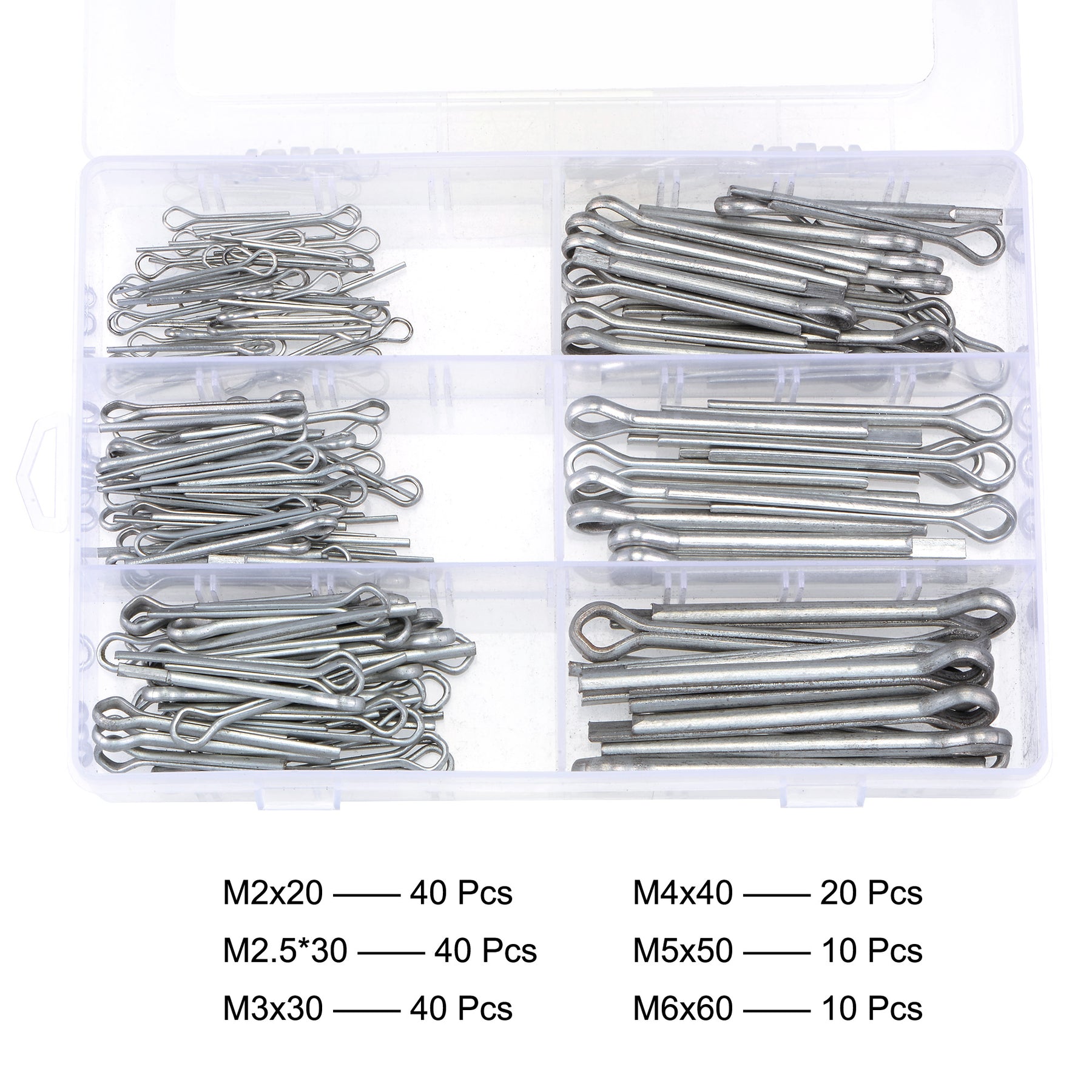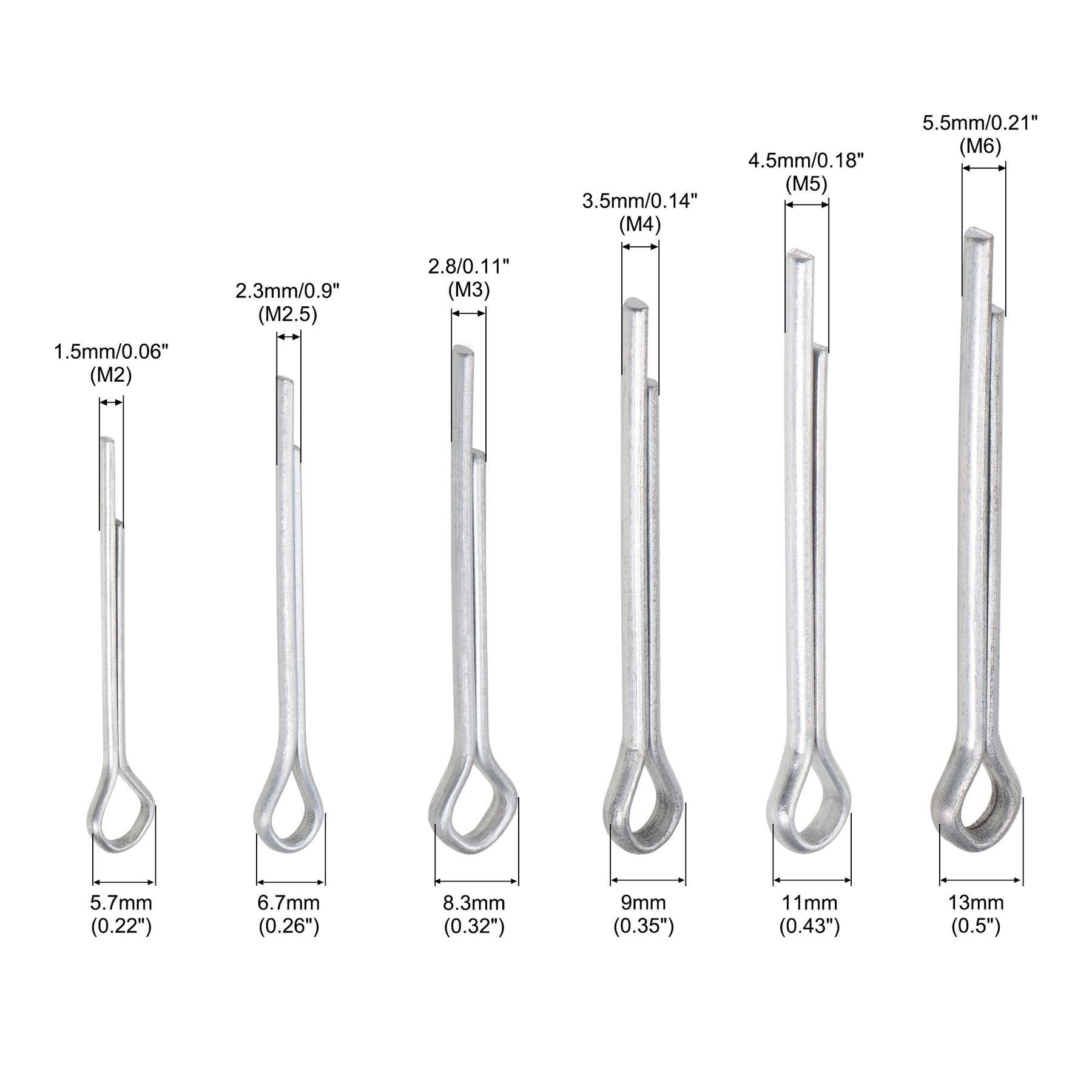 Specifications: Cotter Pin Diameter:1.5mm/0.06"(M2),2.3mm/0.9"(M2.5),2.8/0.11"(M3),3.5mm/0.14"(M4),4.5mm/0.18"(M5),5.5mm/0.21"(M6) Head Diameter:5.7mm/0.22"(M2),6.7mm/0.26"(M2.5),8.3/0.32"(M3),9mm/0.35"(M4),11mm/0.43"(M5),13mm/0.5"(M6) Color: Silver tone Material: Carbon Steel with white zinc plated