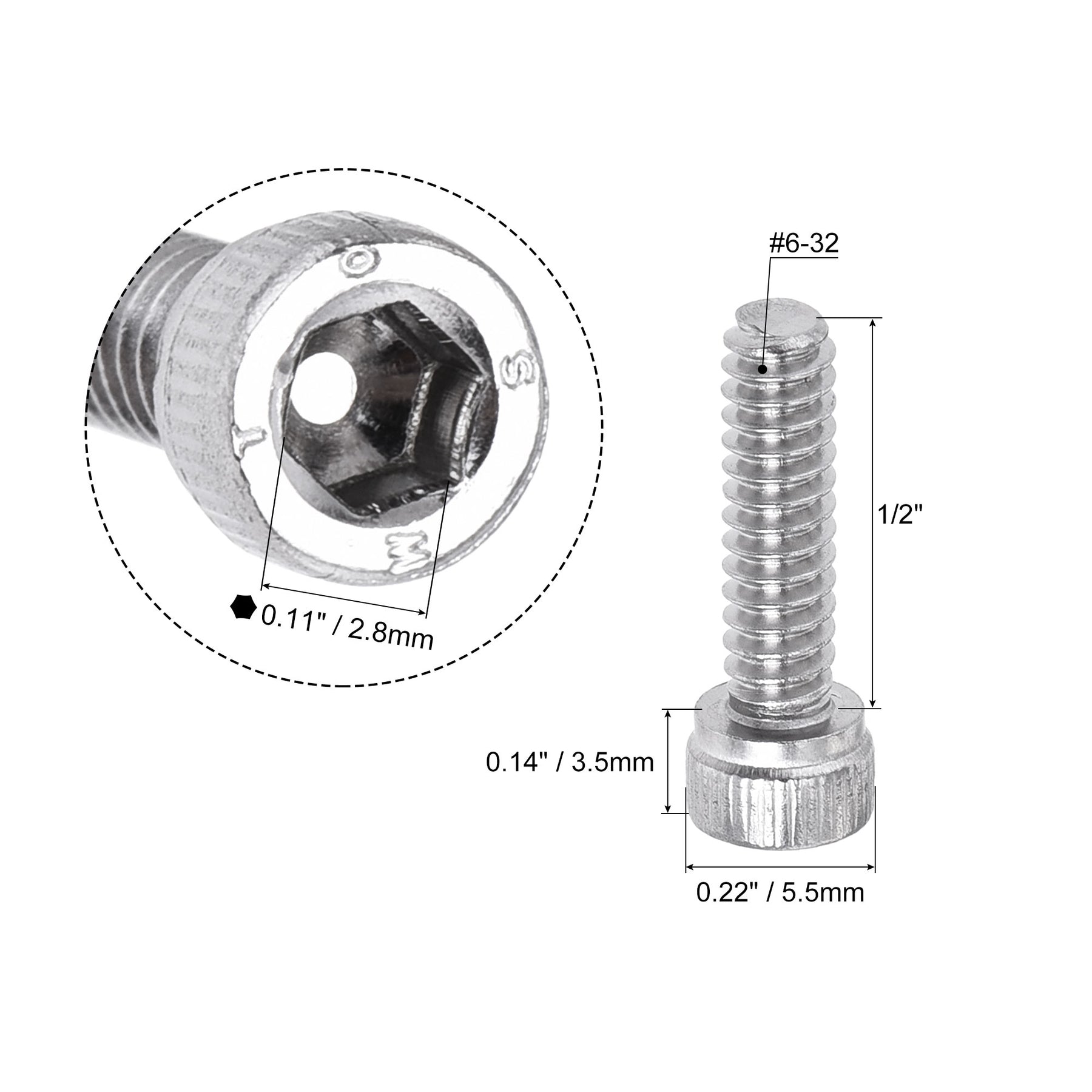 Specification: Product Name: Hex Socket Head Bolt Color: Silver Tone Material: 304 Stainless Steel Surface Treatment: Polished Processing Technology: Cold Forging+Thread Rolling Thread Diameter: #6-32 Screw Length: 1/2" Head Size: 5.5 x 3.5mm / 0.22" x 0.14"(D*H) Hex Socket Head Width: 2.8mm / 0.11"