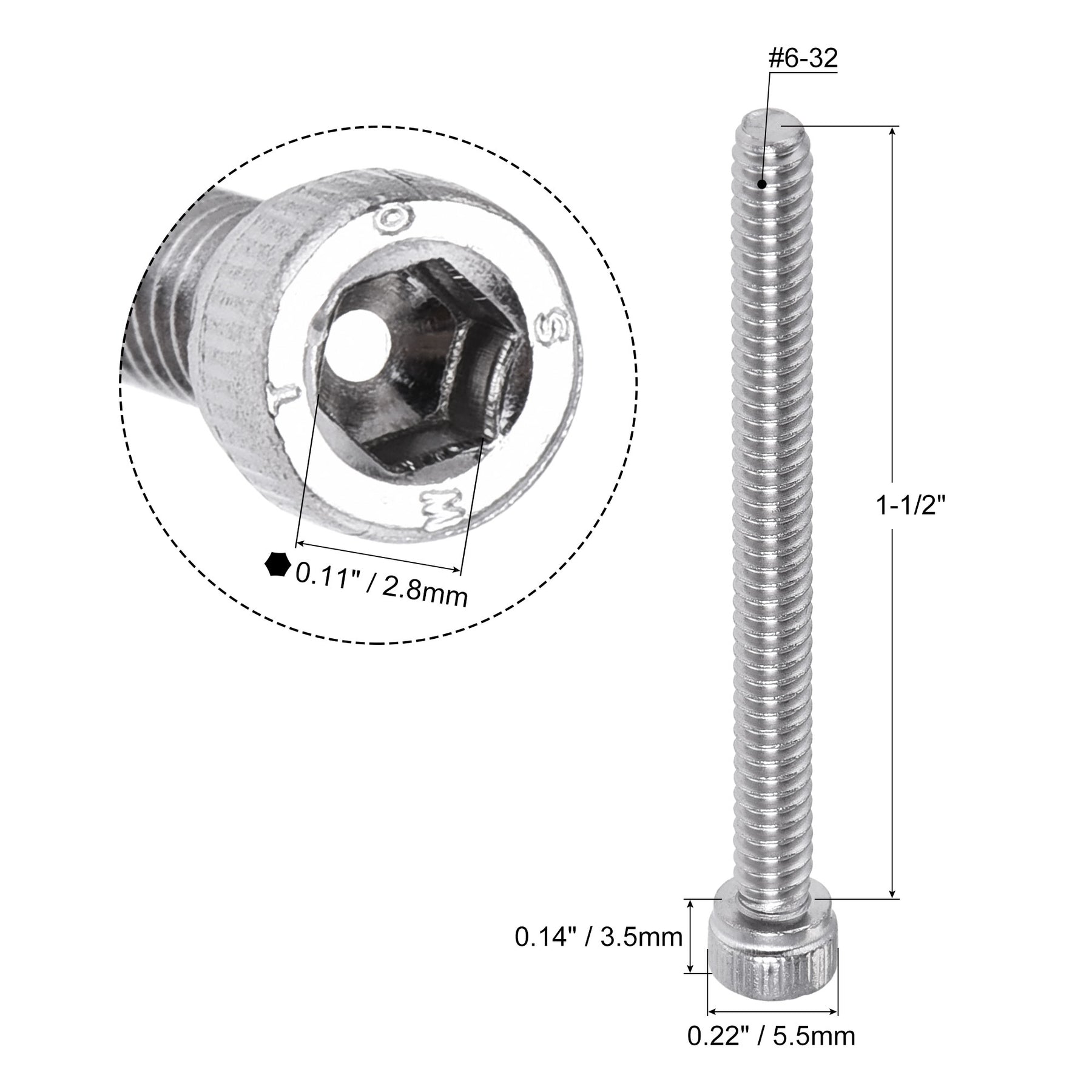 Specification: Product Name: Hex Socket Head Bolt Color: Silver Tone Material: 304 Stainless Steel Surface Treatment: Polished Processing Technology: Cold Forging+Thread Rolling Thread Diameter: #6-32 Screw Length: 1-1/2" Head Size: 5.5 x 3.5mm / 0.22" x 0.14"(D*H) Hex Socket Head Width: 2.8mm / 0.11"