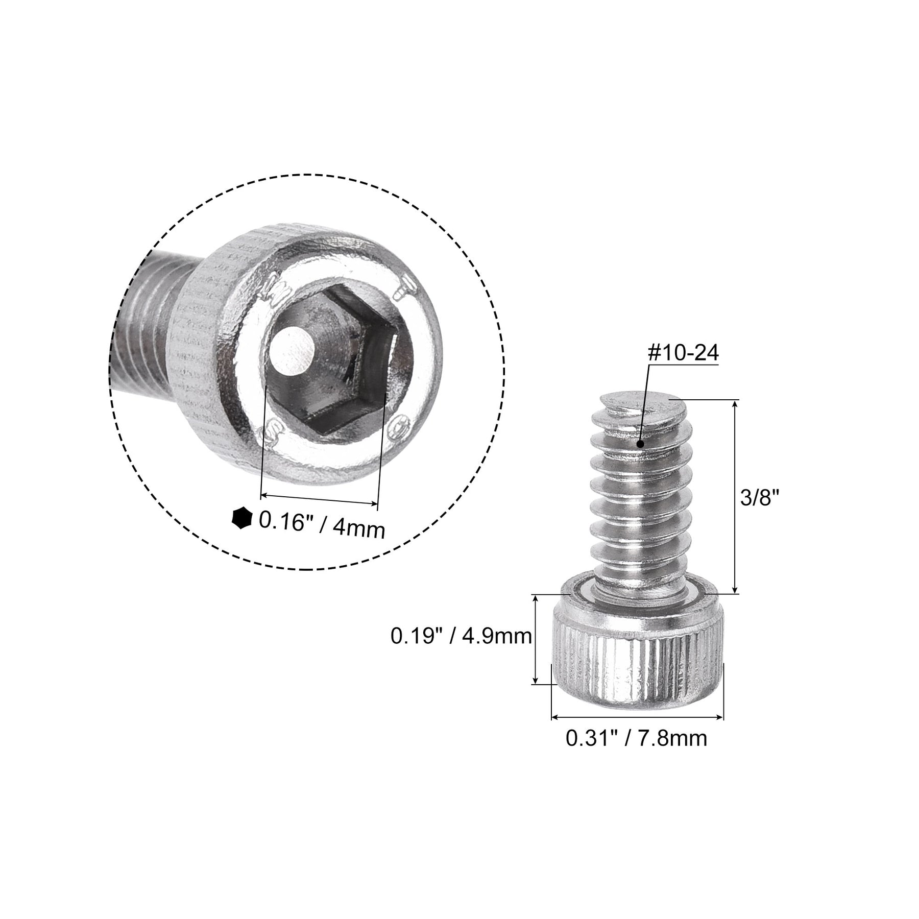 Thread Diameter: #10-24; Screw Length: 3/8"; Head Size: 7.8 x 4.9mm / 0.31" x 0.19"(D*H); Hex Socket Head Width: 4mm / 0.16"