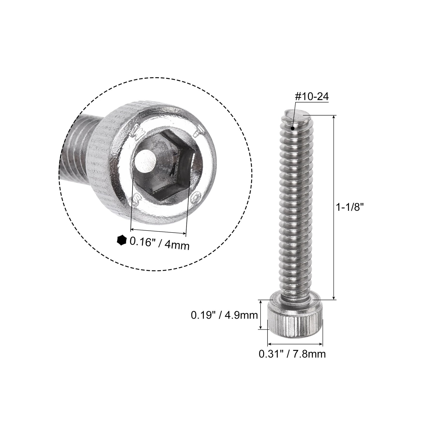 Specification: Product Name: Hex Socket Head Bolt Color: Silver Tone Material: 304 Stainless Steel Surface Treatment: Polished Processing Technology: Cold Forging+Thread Rolling Thread Diameter: #10-24 Screw Length: 1-1/8" Head Size: 7.8 x 4.9mm / 0.31" x 0.19"(D*H) Hex Socket Head Width: 4mm / 0.16"